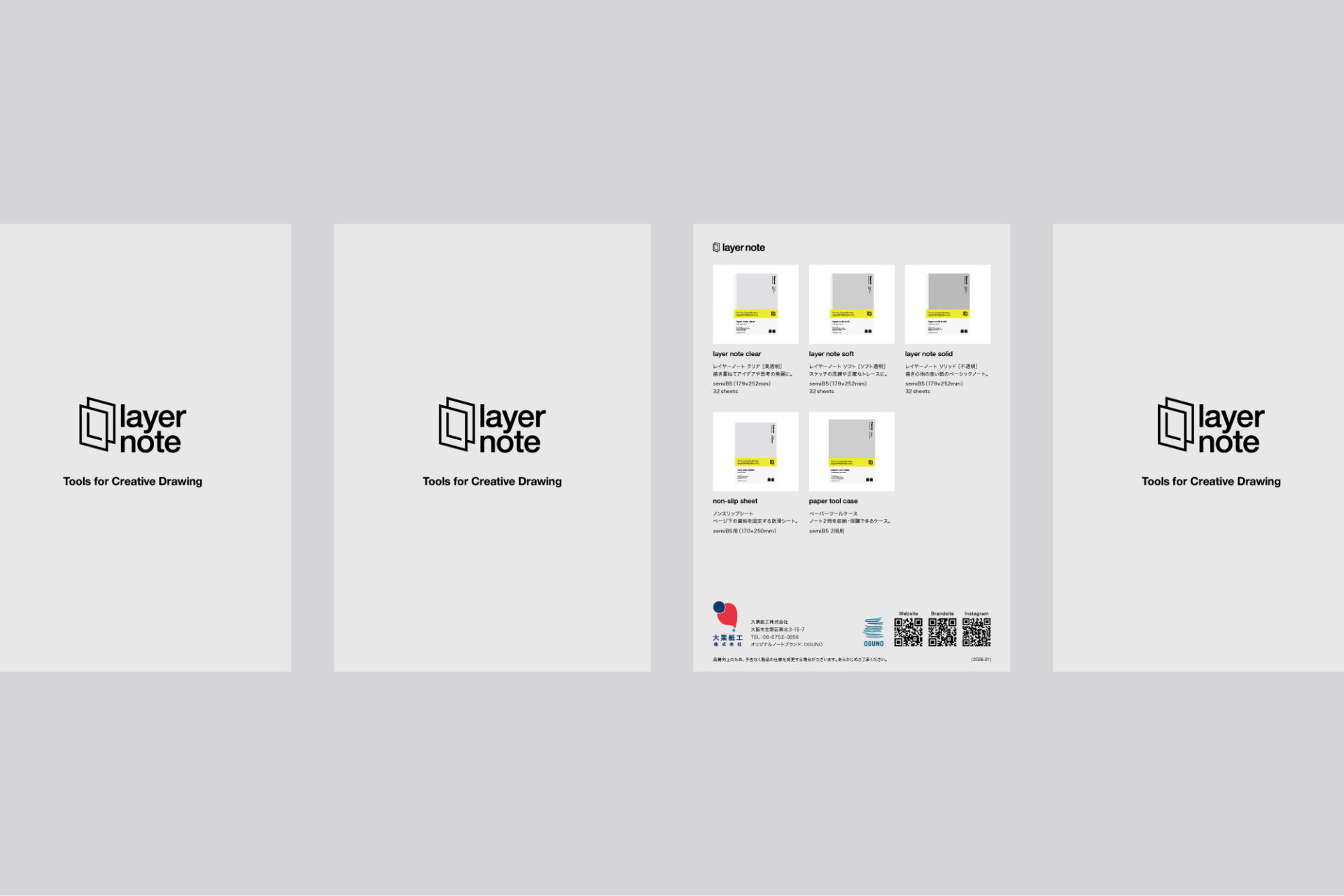 layer note(レイヤーノート)は、思考を描き重ねて発想・整理・洗練するノートツールです。紙の透明度が異なる3種類のノートと、創造プロセスを支えるツールをラインナップしました。創業1930年より培った製本技術で透ける紙を綴じ、思考を立体的に可視化できるノートを実現しました。