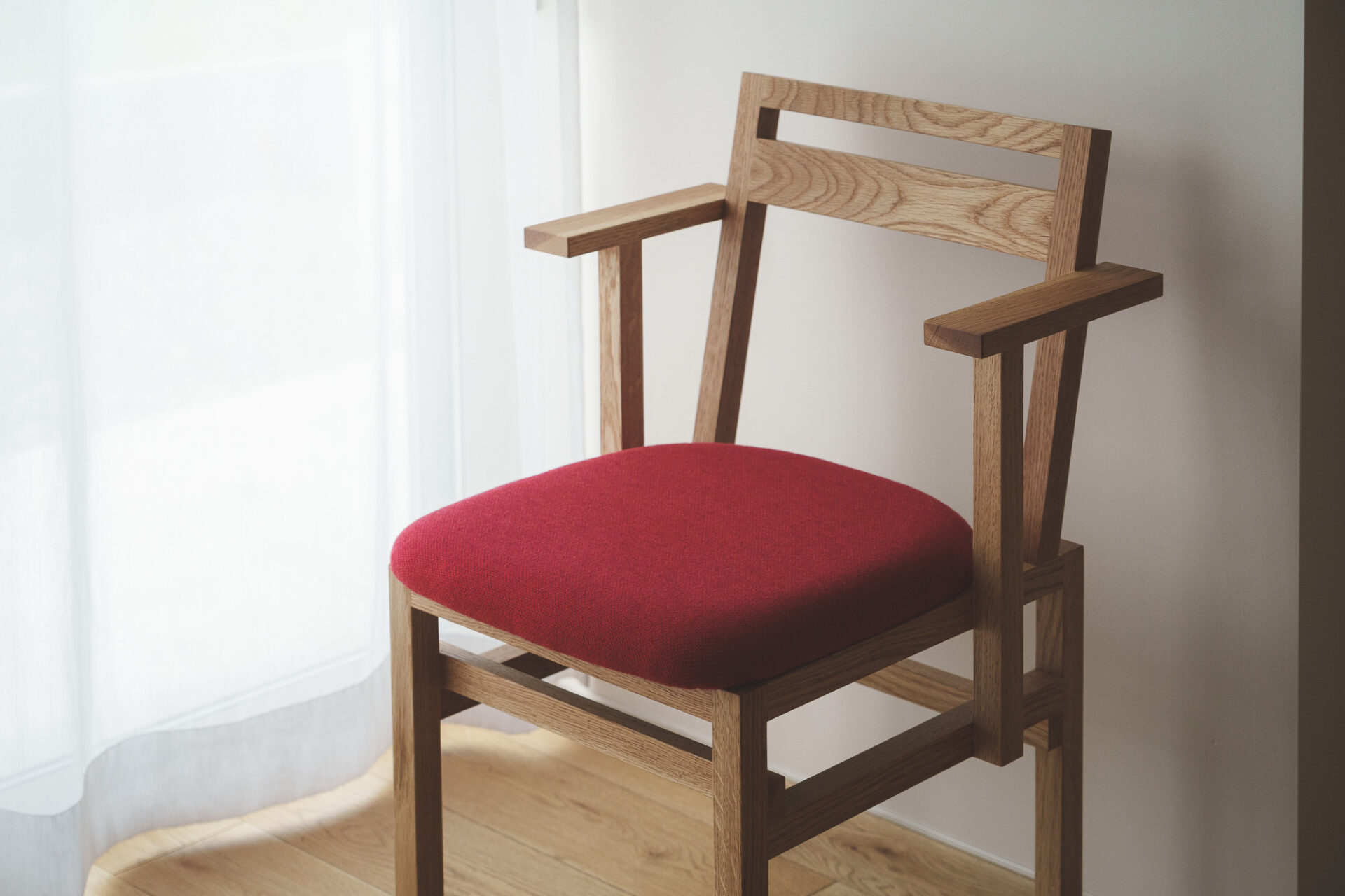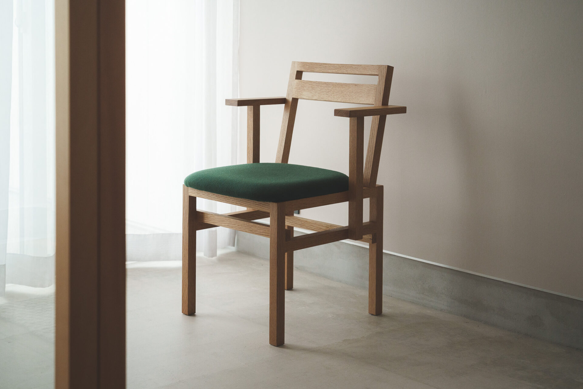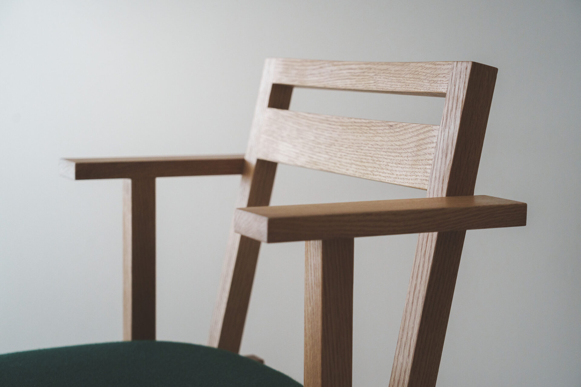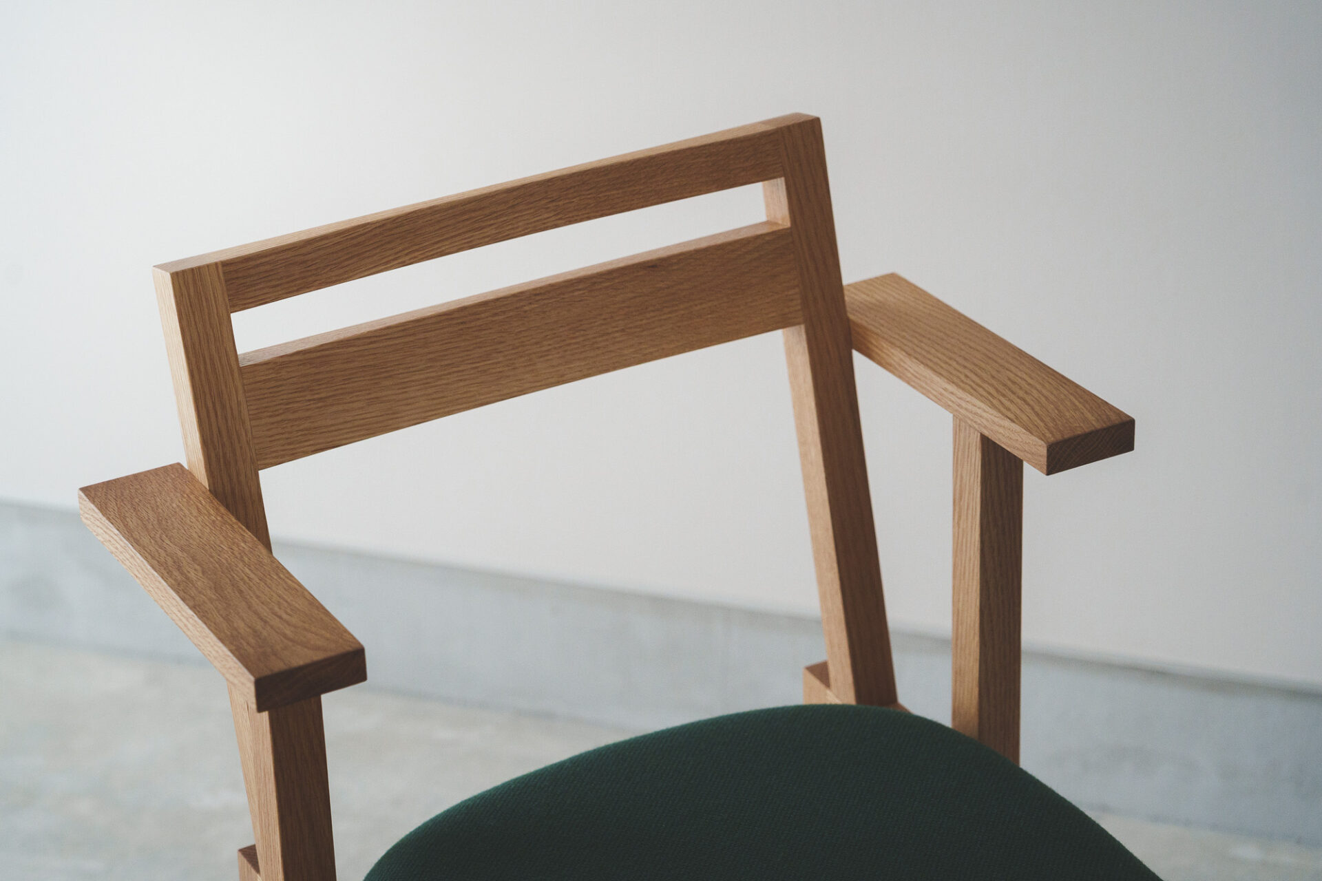 食事や仕事で背を起こす姿勢と、食後の団欒や小休憩でもたれる姿勢。ふたつの姿勢を満たす位置関係で、シート・バックレスト・アームレストを留めるように直線で繋いだこの椅子の構造は、椅子の様式の研究過程で生まれたものです。