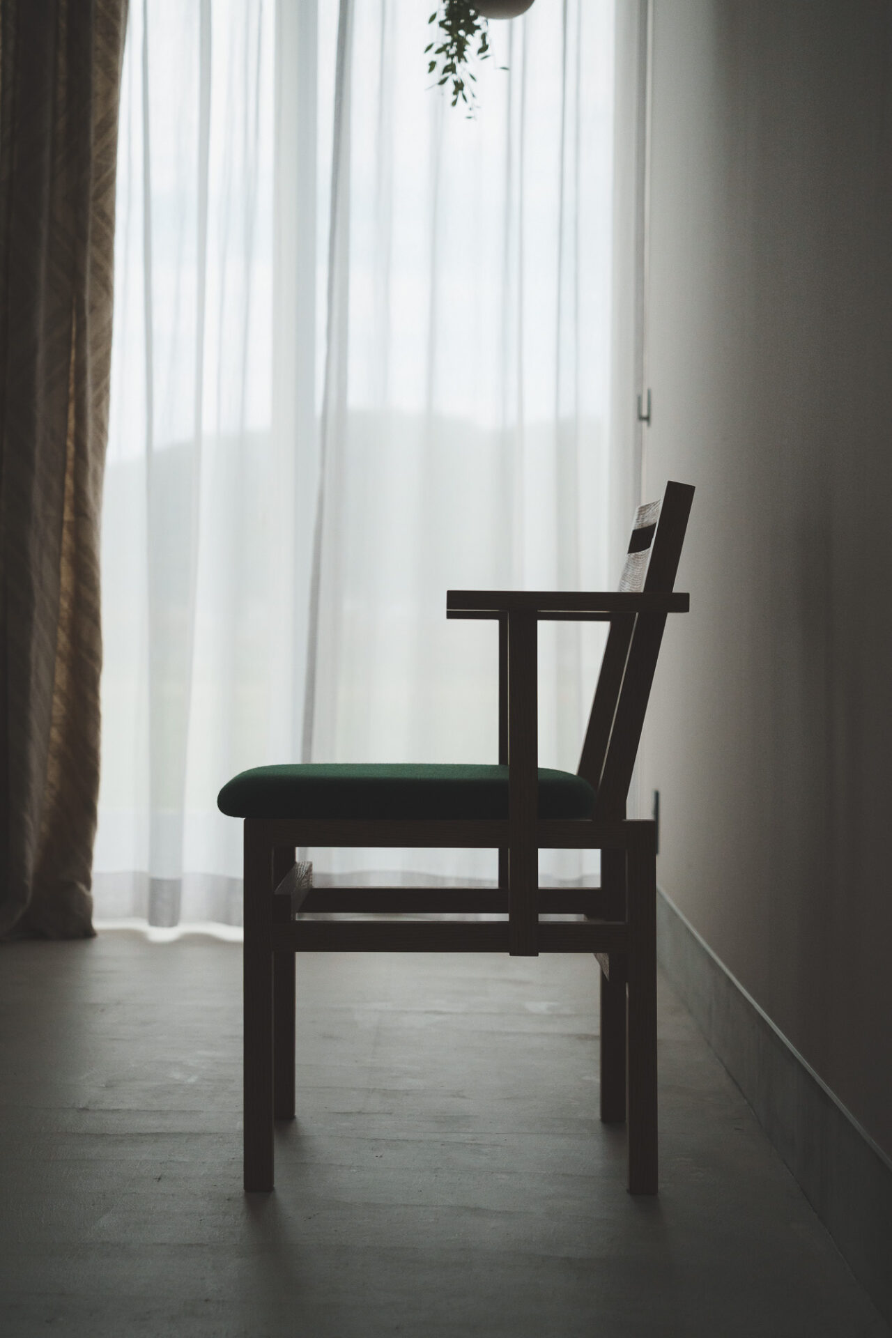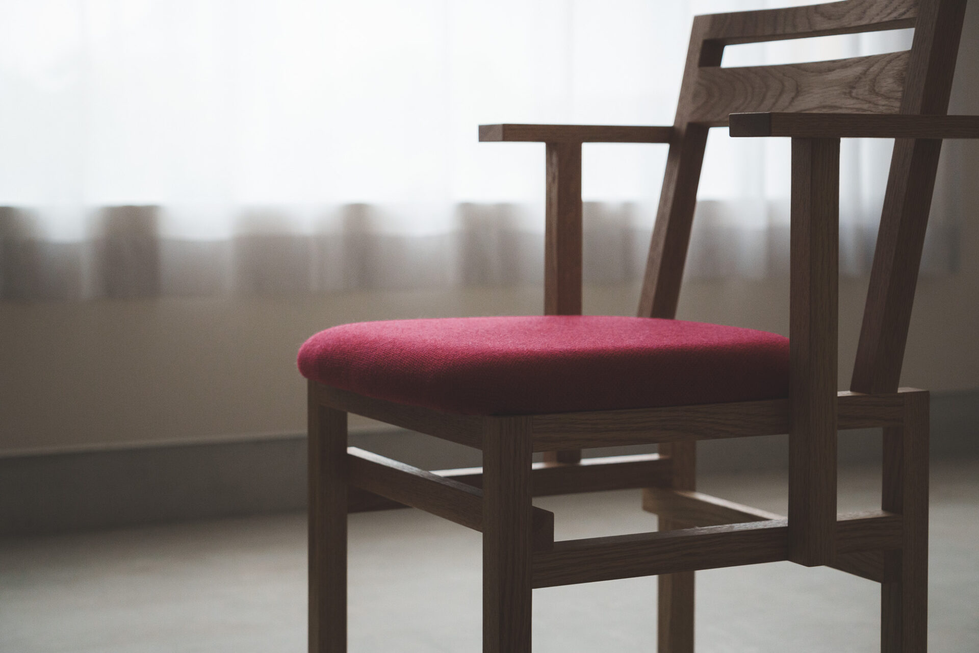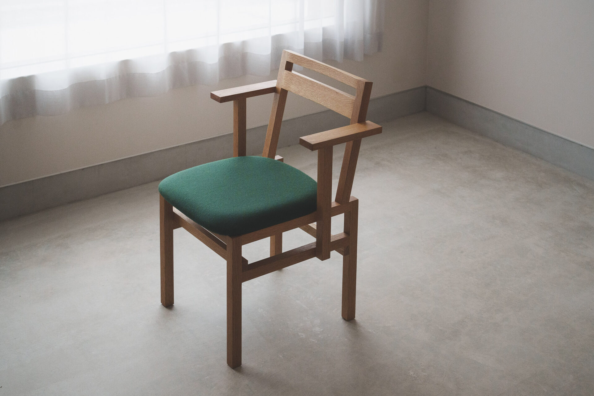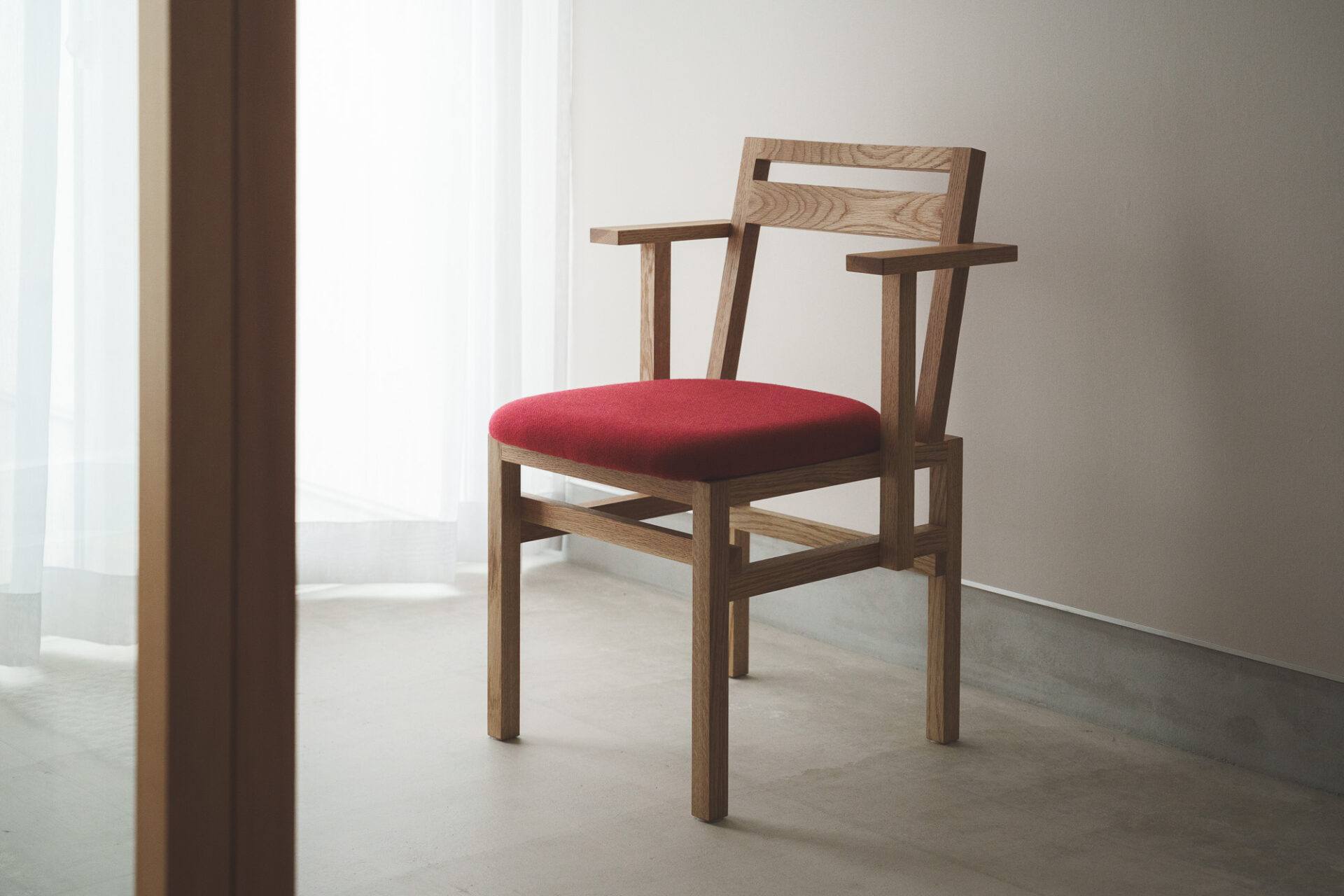 食事や仕事で背を起こす姿勢と、食後の団欒や小休憩でもたれる姿勢。ふたつの姿勢を満たす位置関係で、シート・バックレスト・アームレストを留めるように直線で繋いだこの椅子の構造は、椅子の様式の研究過程で生まれたものです。