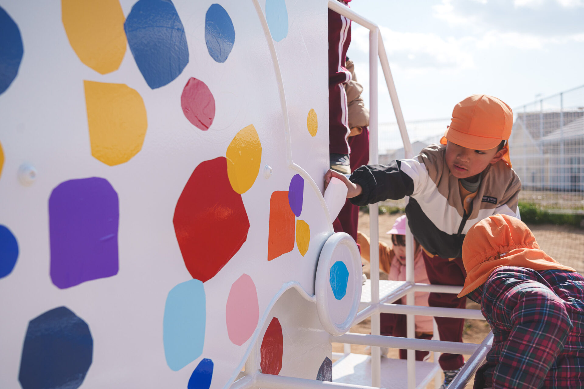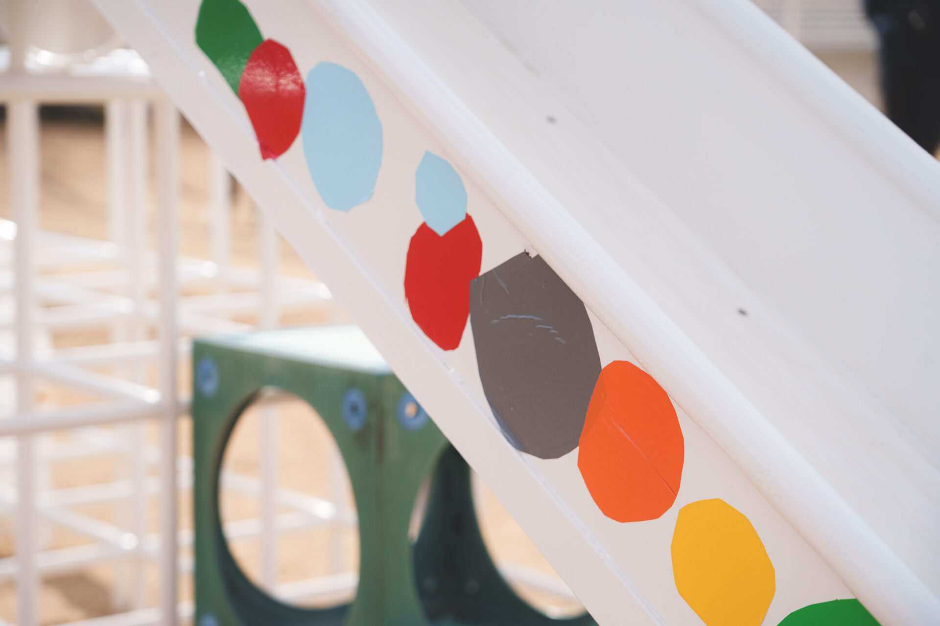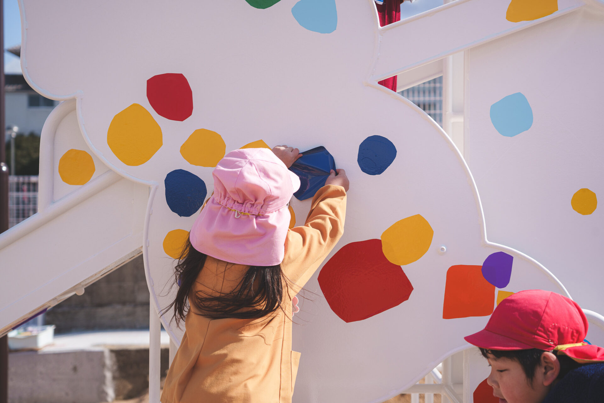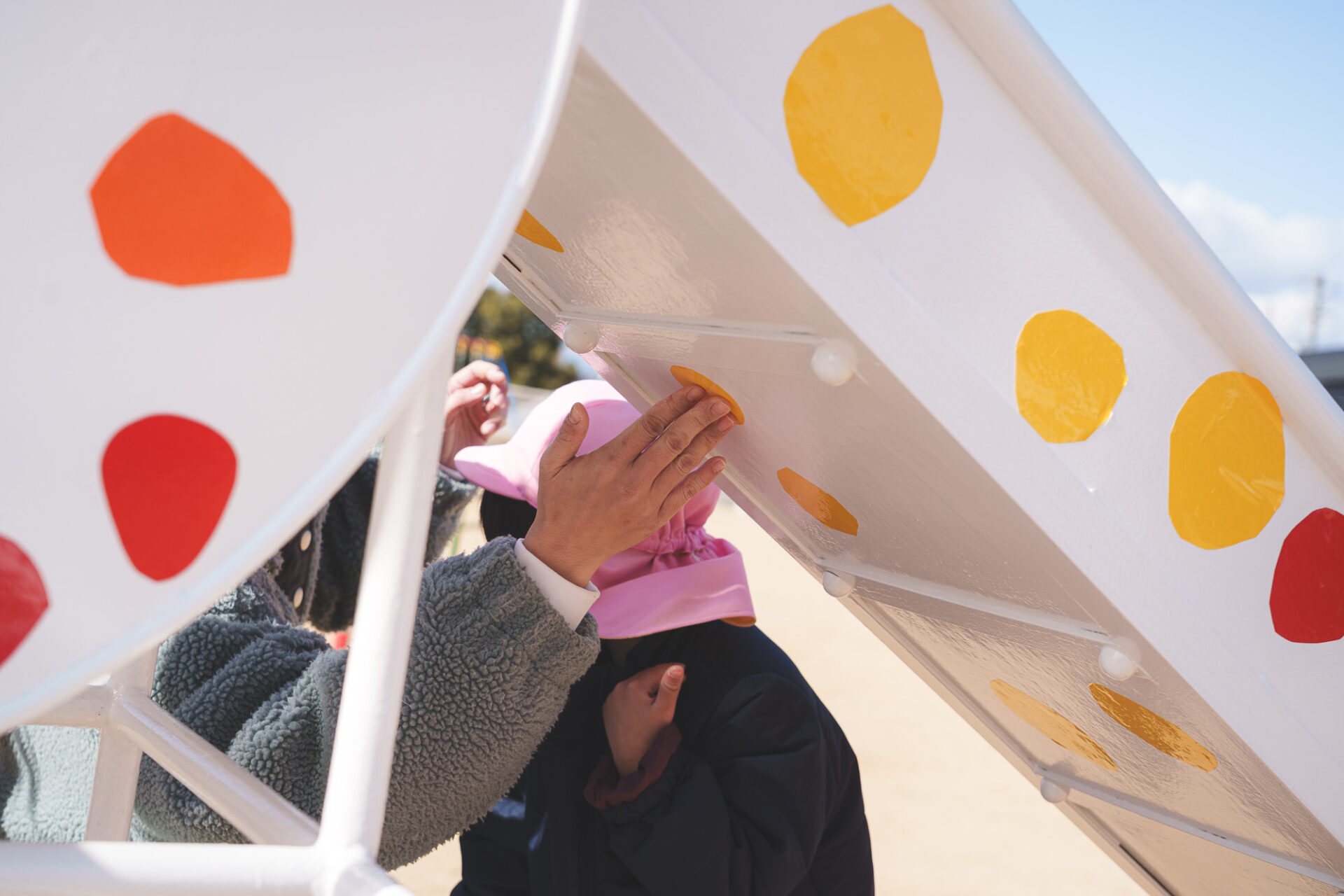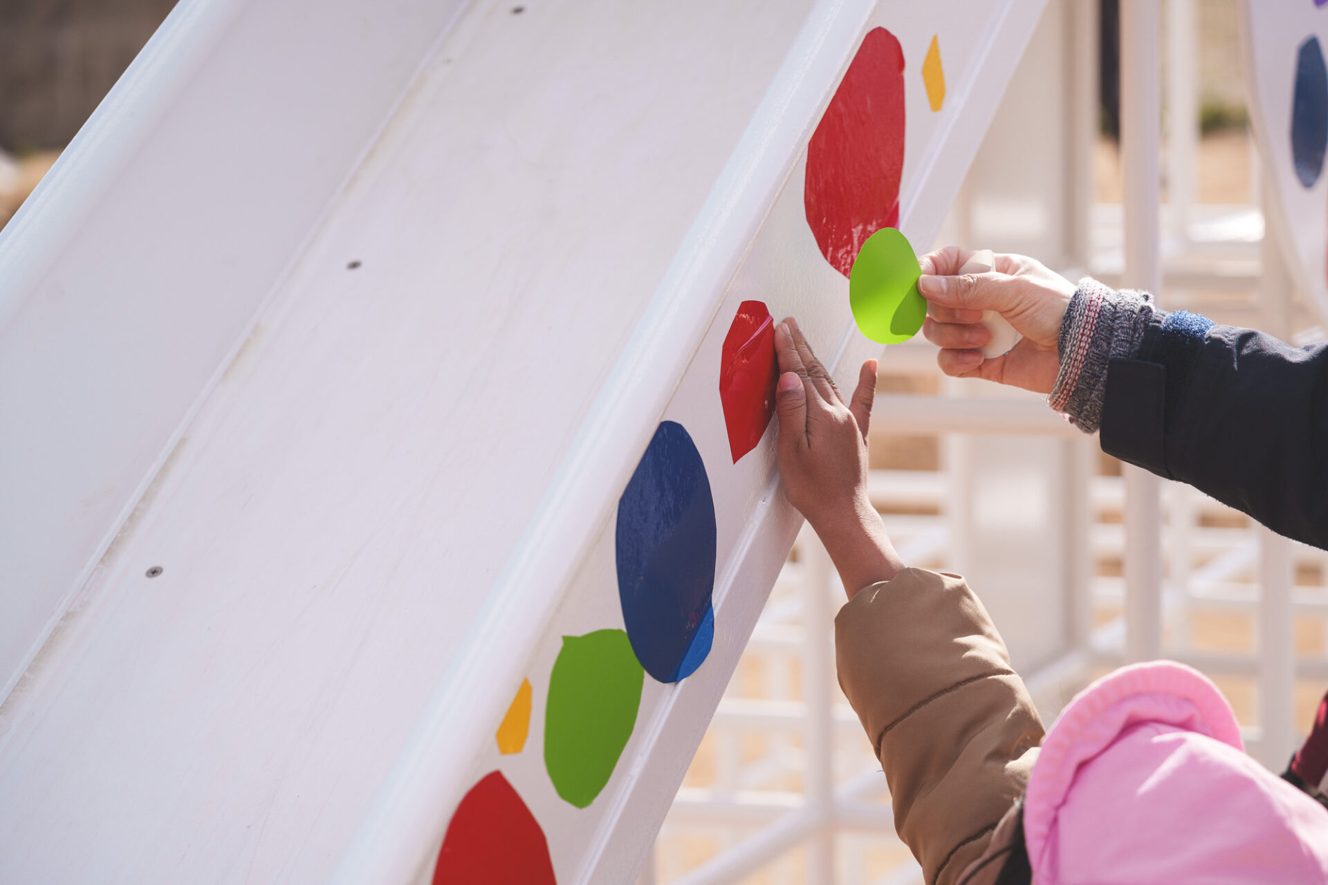 形と色で園児それぞれの「個性」を発揮した横断幕に対して、すべり台では、みんなで大量のまるをつくり、ひとつの遊具を完成させる「協力・共有」体験を創造プロセスに組み込みました。