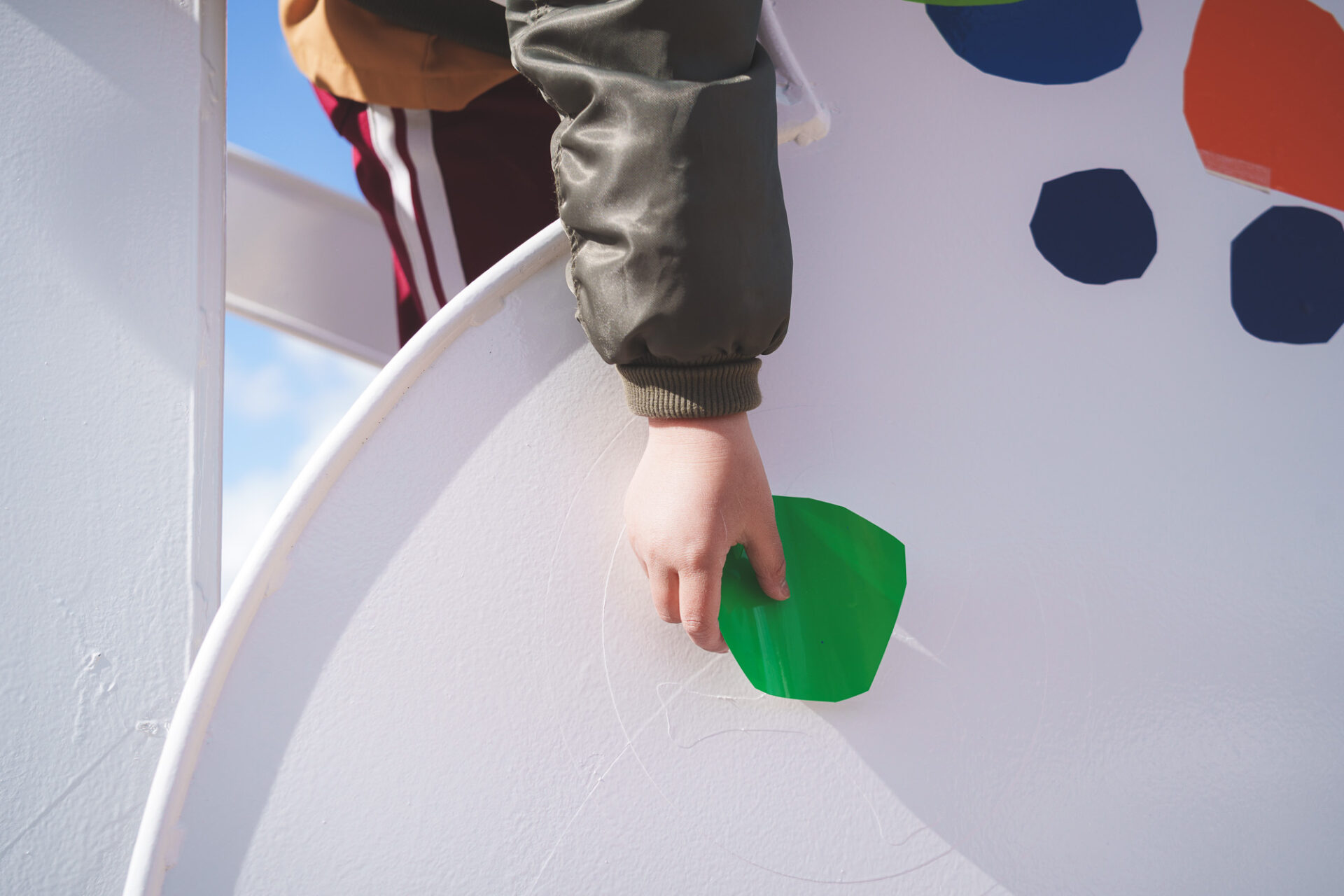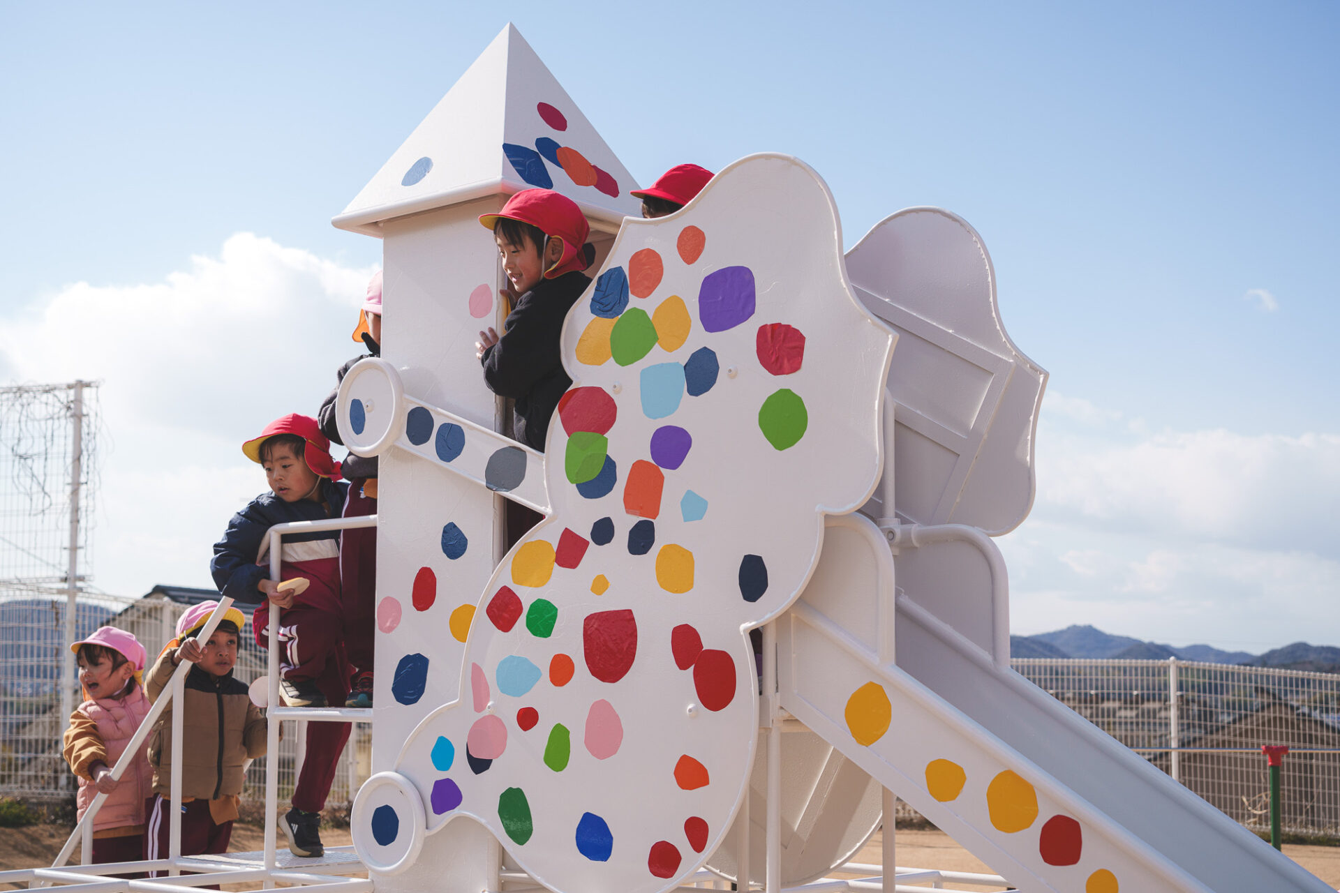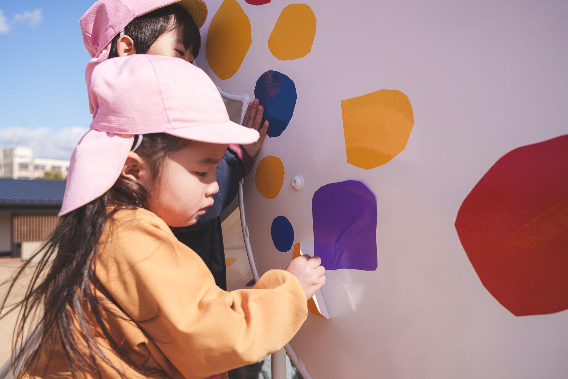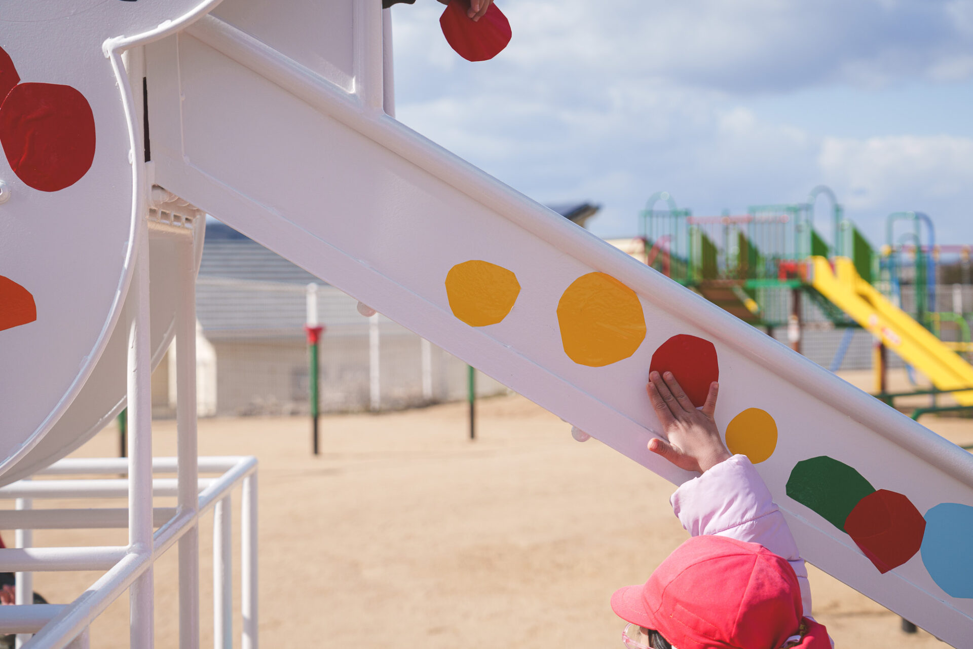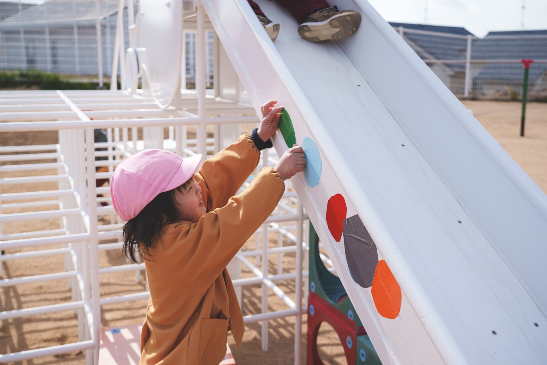 形と色で園児それぞれの「個性」を発揮した横断幕に対して、すべり台では、みんなで大量のまるをつくり、ひとつの遊具を完成させる「協力・共有」体験を創造プロセスに組み込みました。