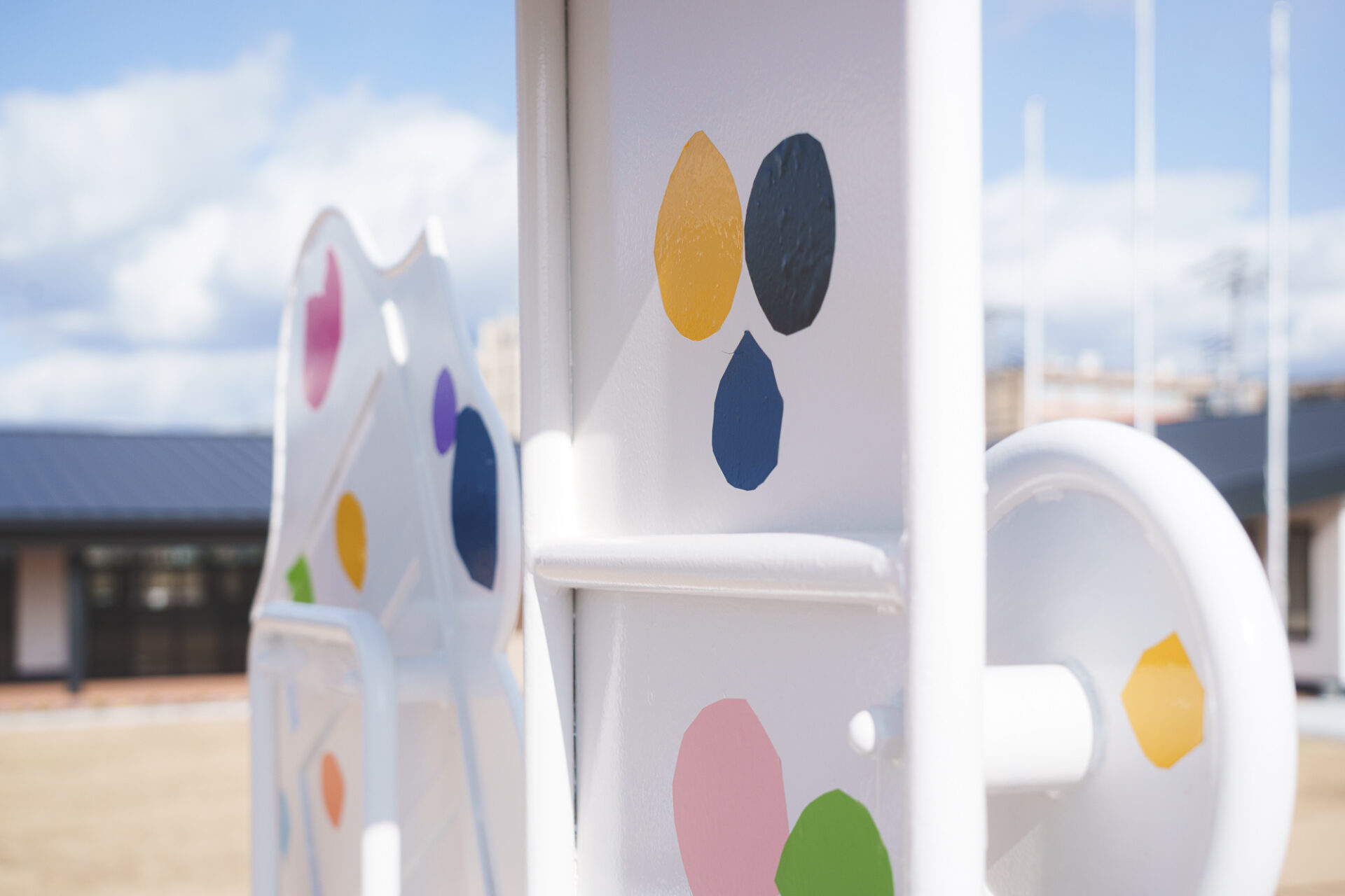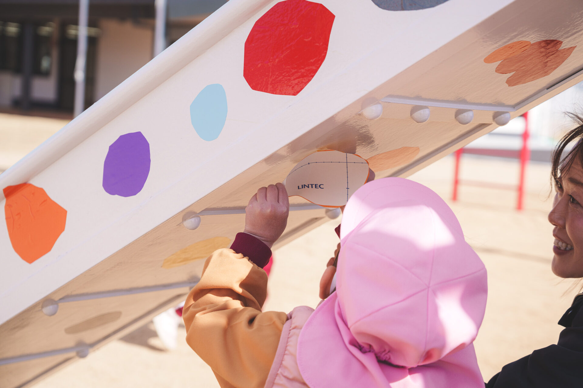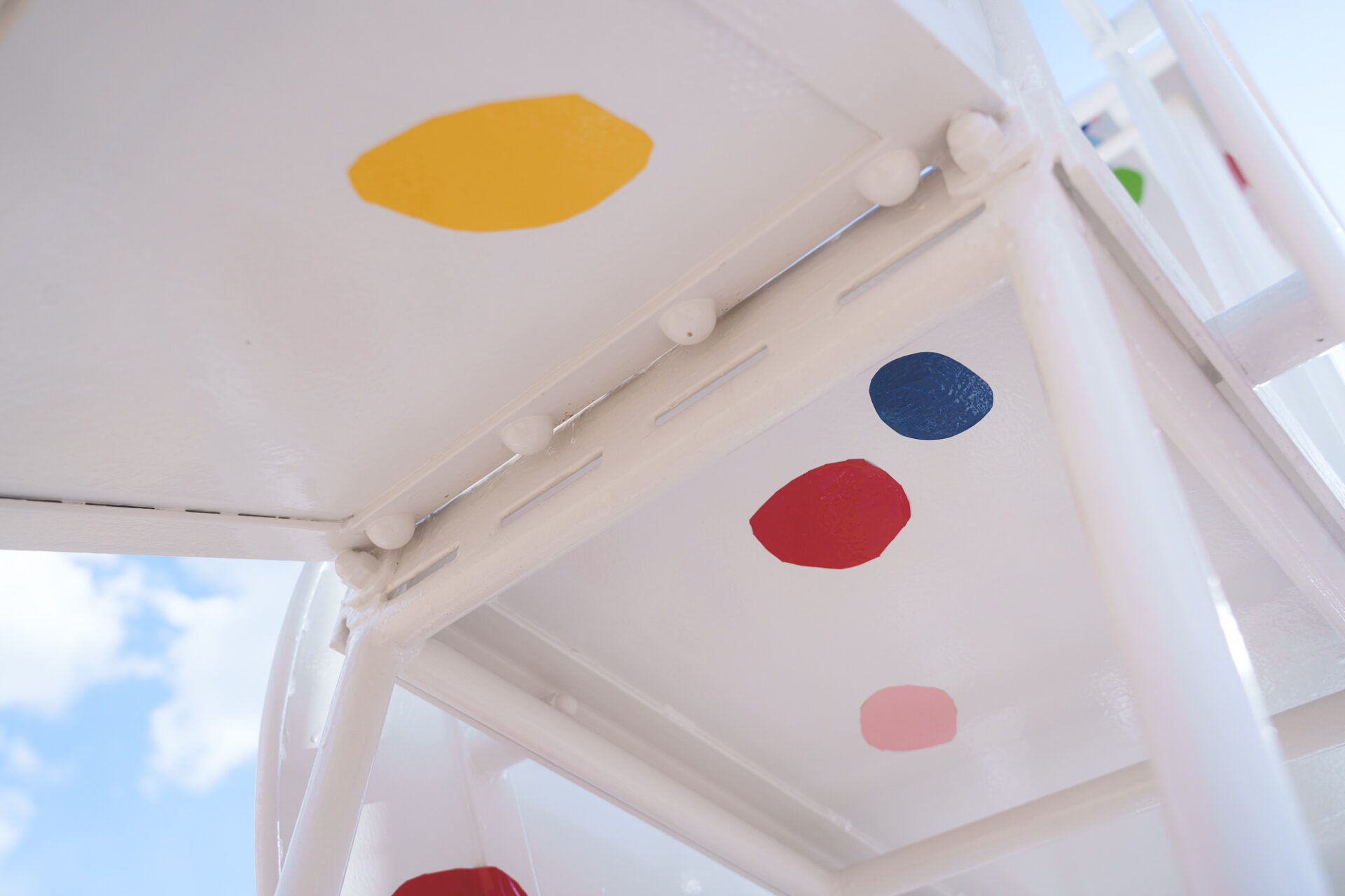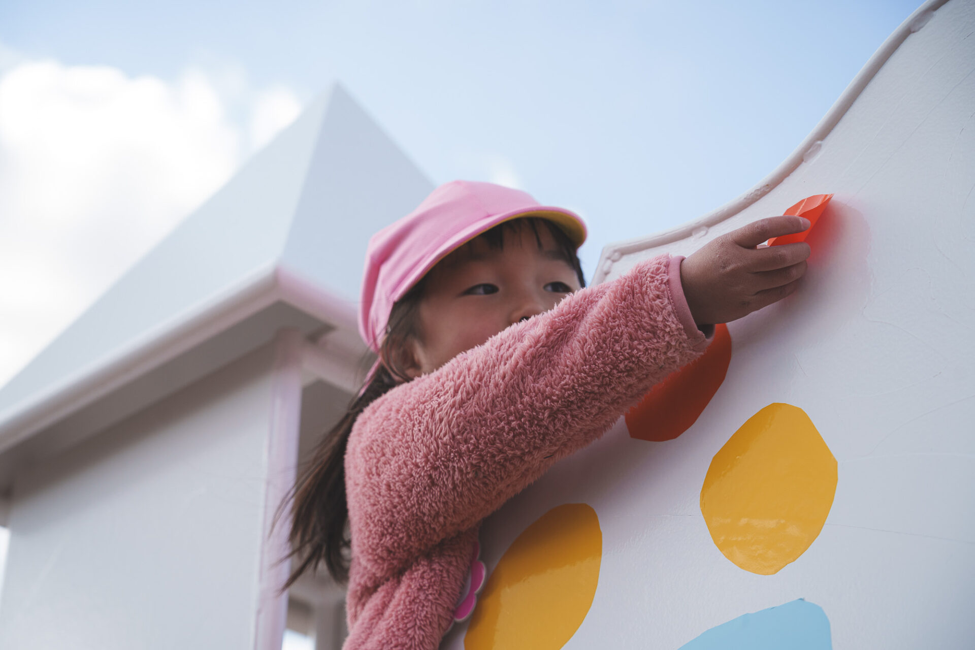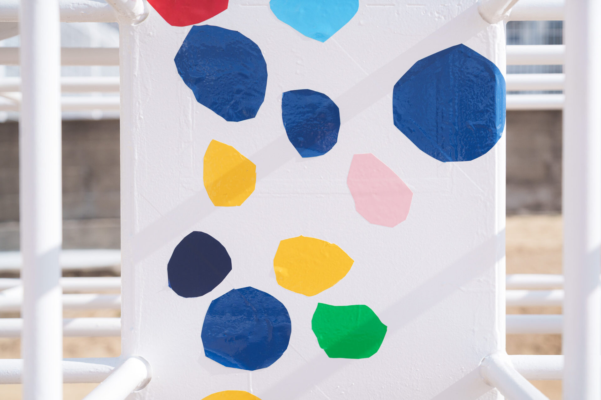 形と色で園児それぞれの「個性」を発揮した横断幕に対して、すべり台では、みんなで大量のまるをつくり、ひとつの遊具を完成させる「協力・共有」体験を創造プロセスに組み込みました。