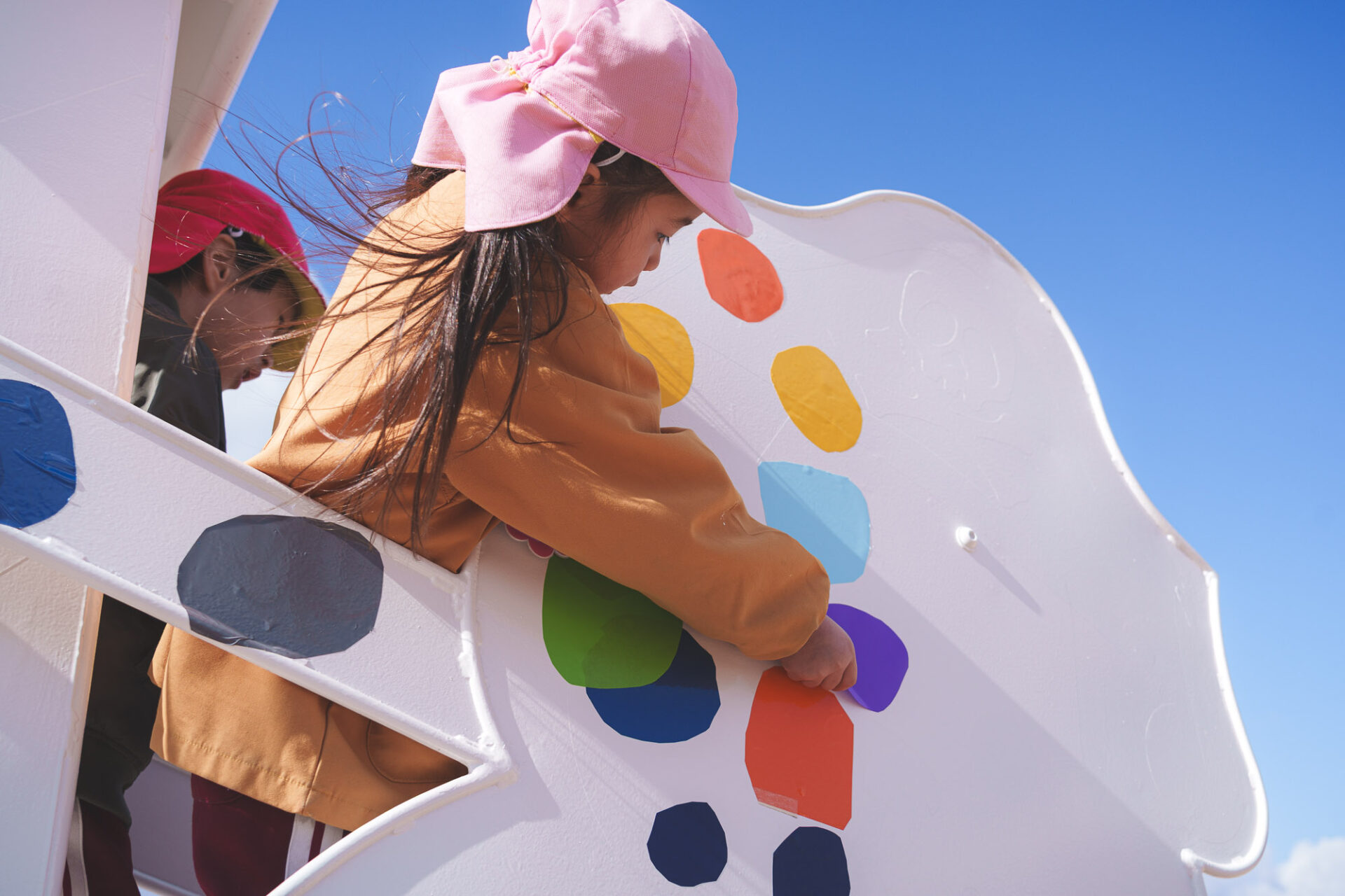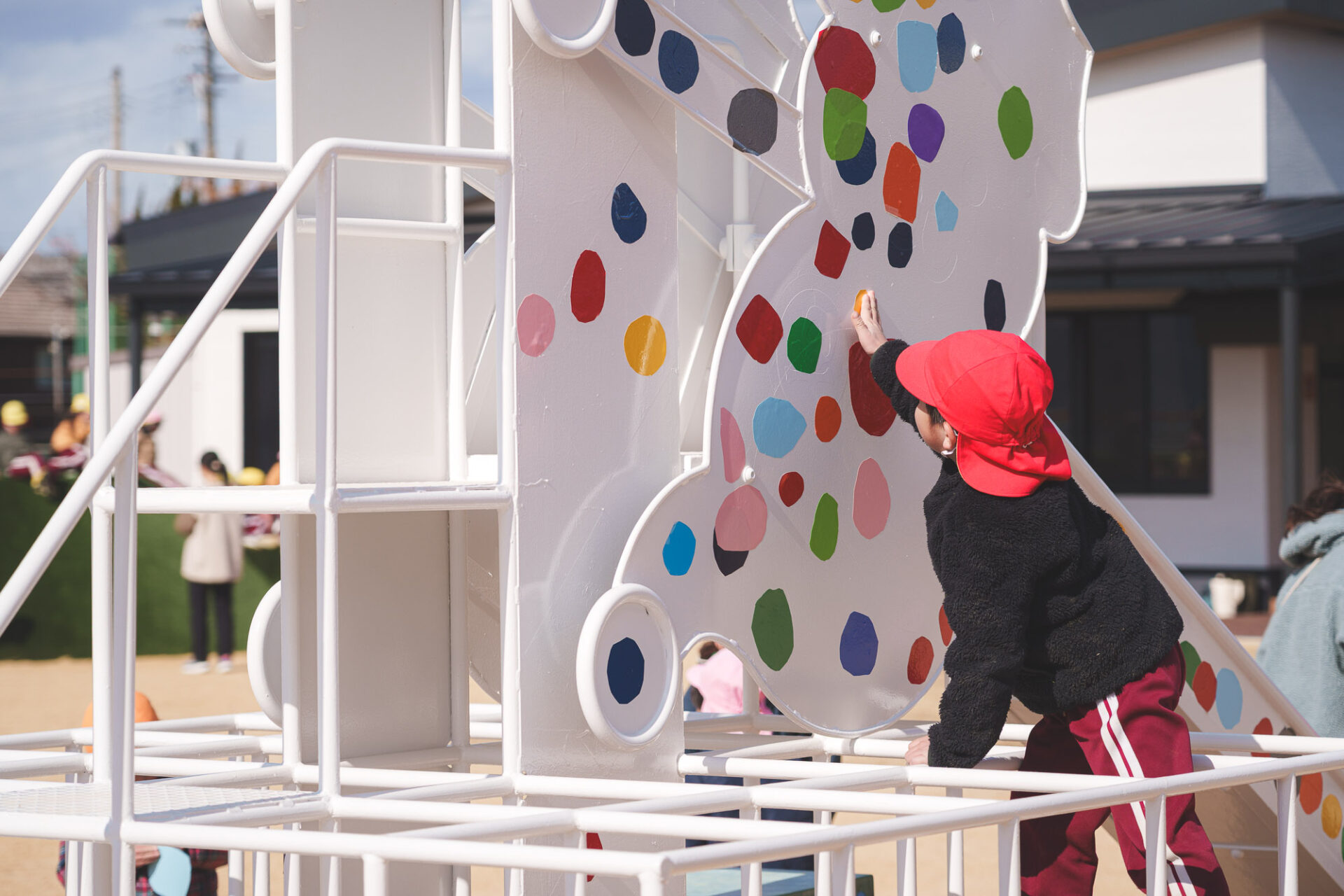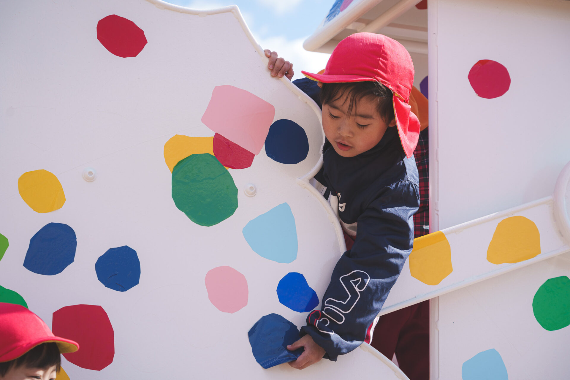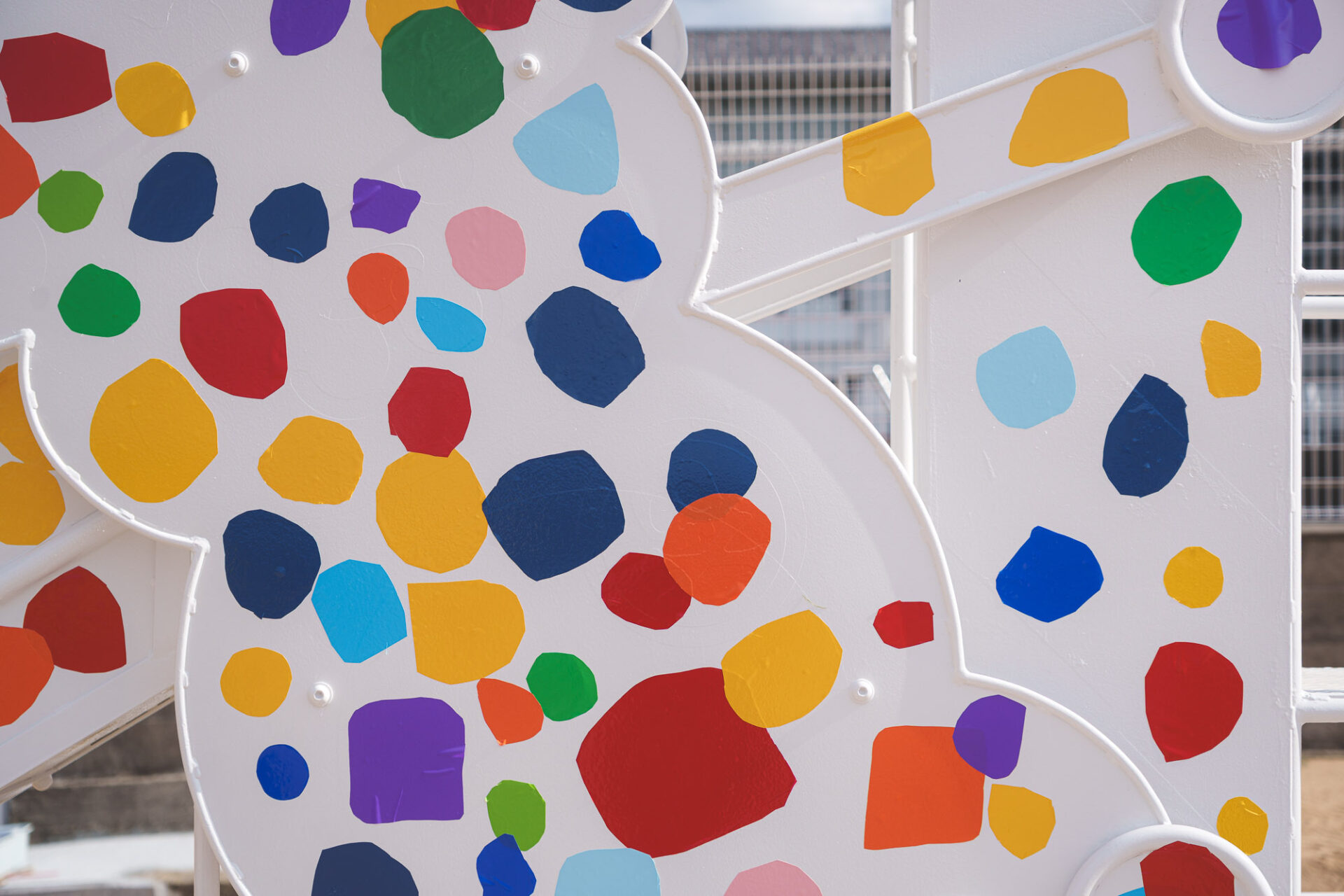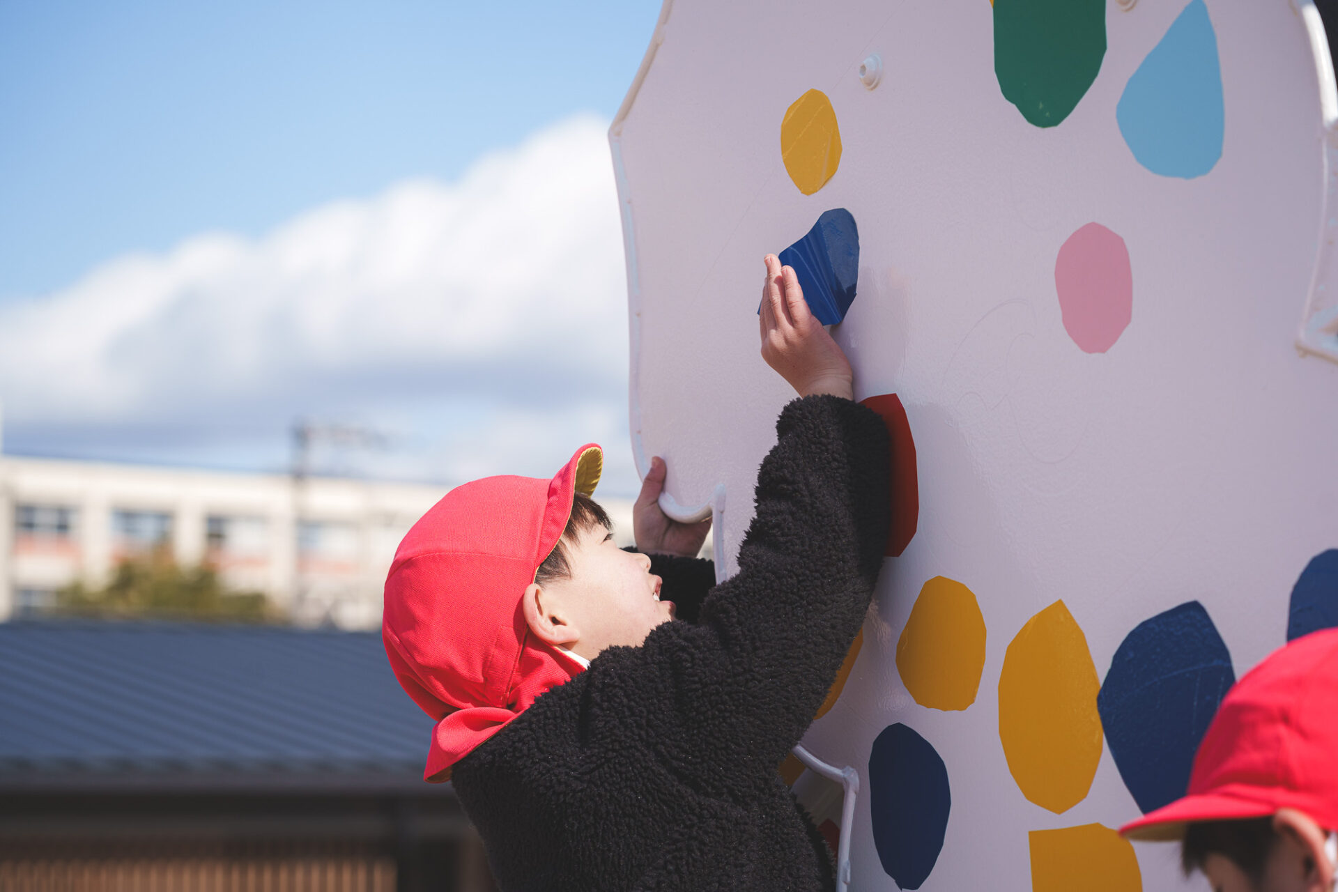 形と色で園児それぞれの「個性」を発揮した横断幕に対して、すべり台では、みんなで大量のまるをつくり、ひとつの遊具を完成させる「協力・共有」体験を創造プロセスに組み込みました。