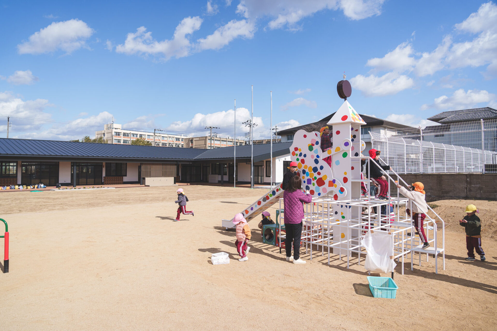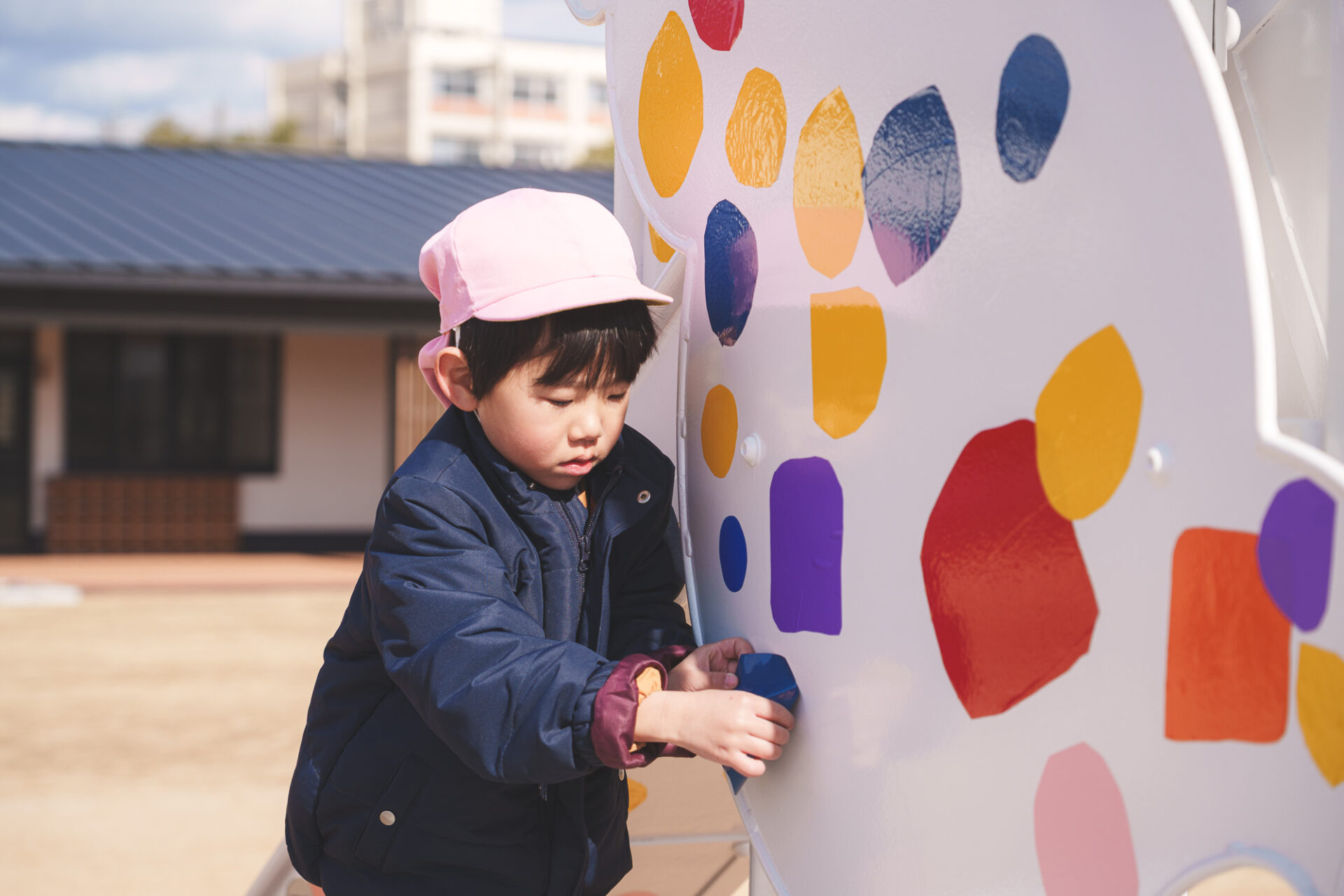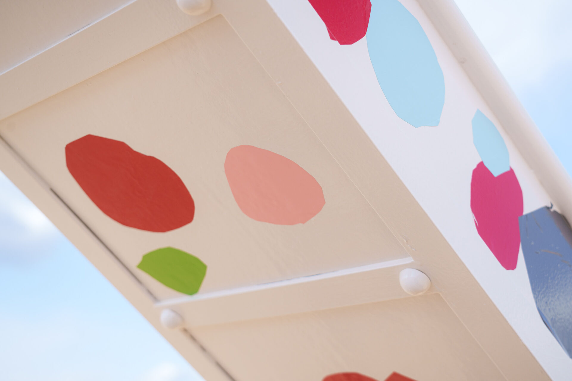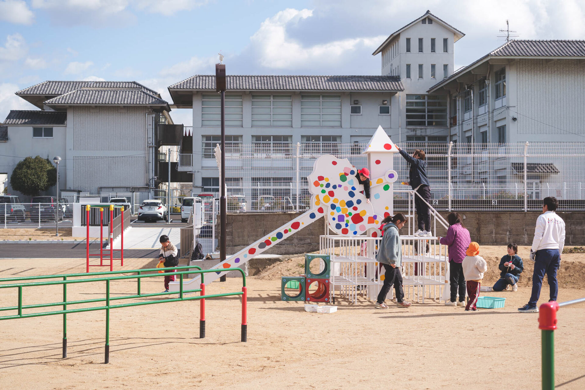 形と色で園児それぞれの「個性」を発揮した横断幕に対して、すべり台では、みんなで大量のまるをつくり、ひとつの遊具を完成させる「協力・共有」体験を創造プロセスに組み込みました。