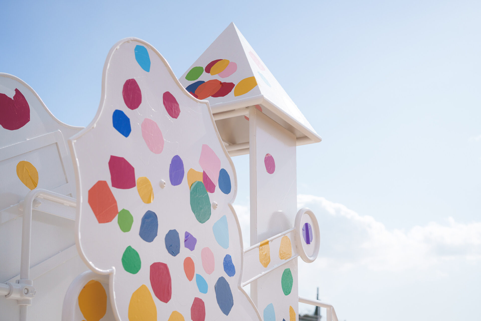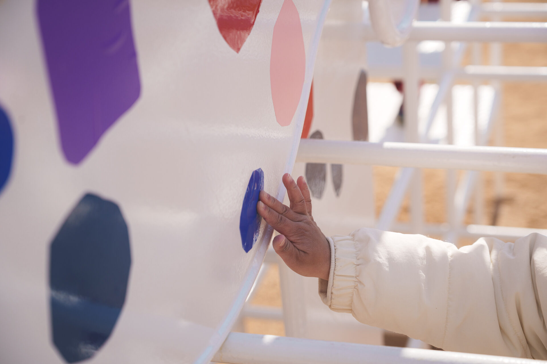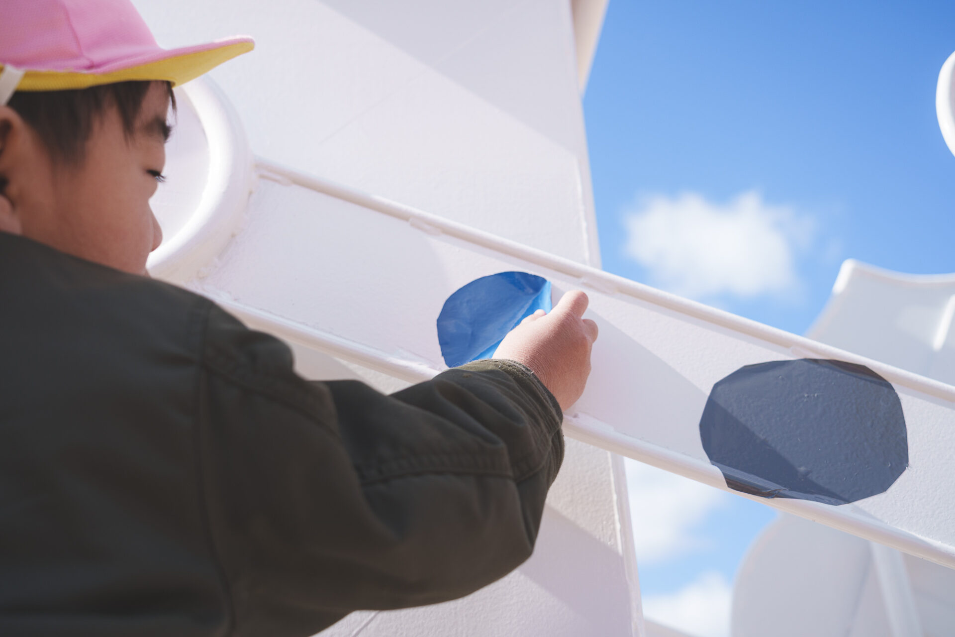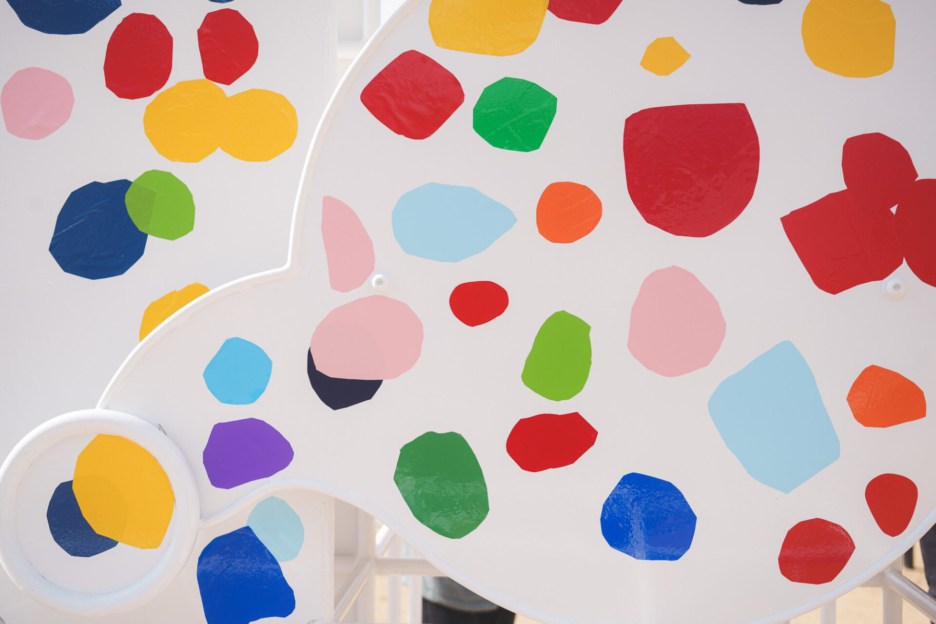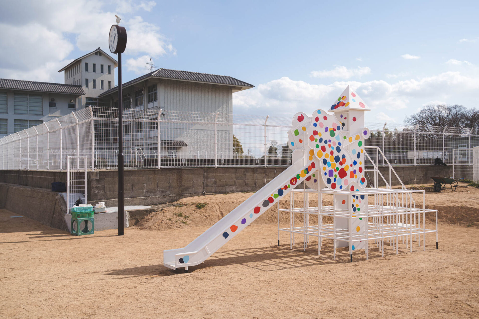形と色で園児それぞれの「個性」を発揮した横断幕に対して、すべり台では、みんなで大量のまるをつくり、ひとつの遊具を完成させる「協力・共有」体験を創造プロセスに組み込みました。