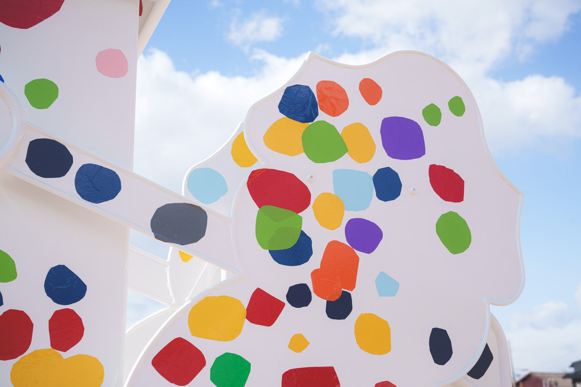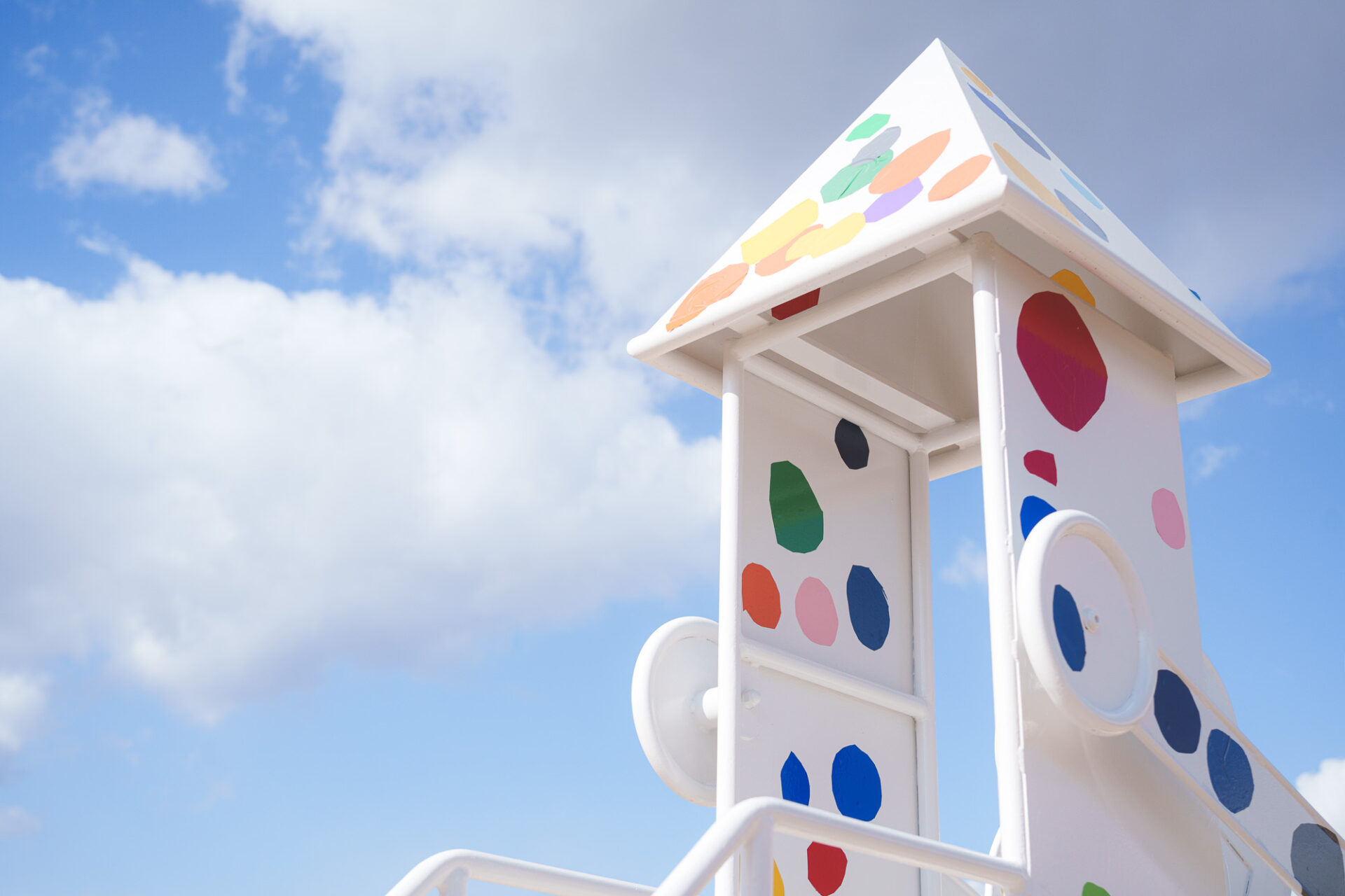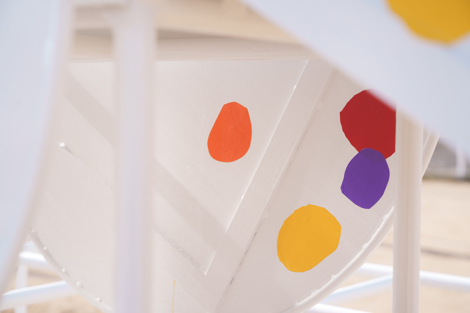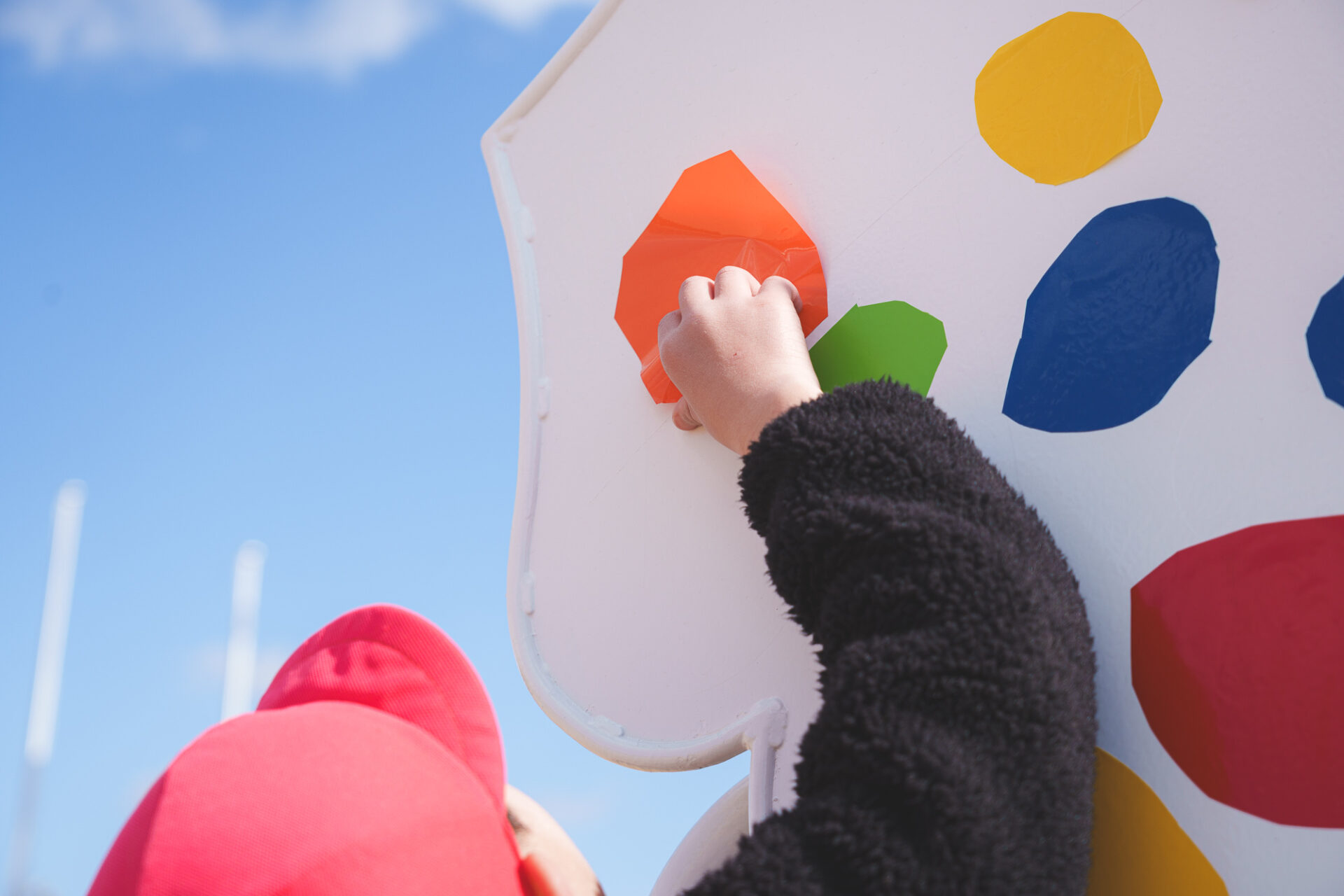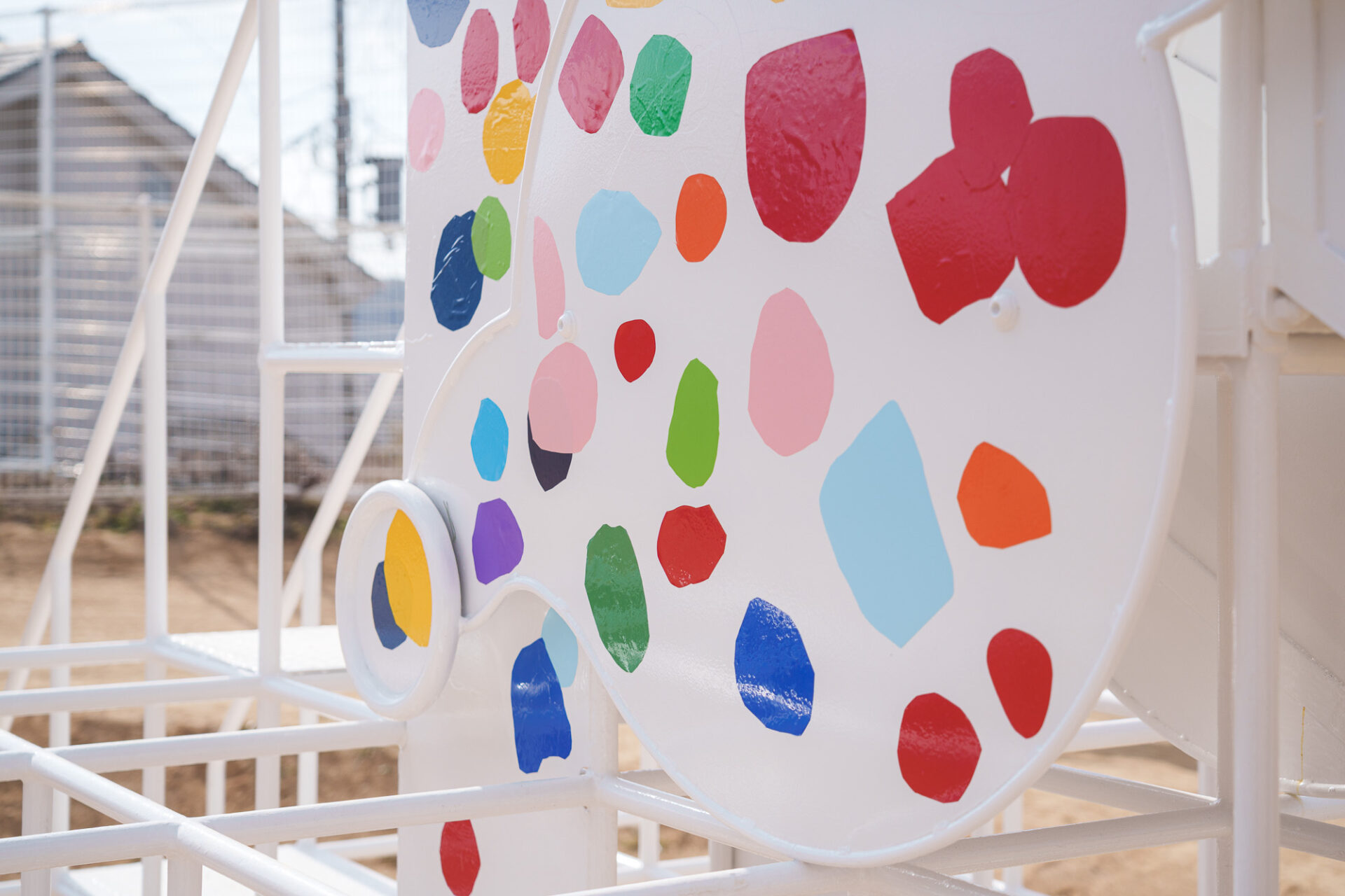 形と色で園児それぞれの「個性」を発揮した横断幕に対して、すべり台では、みんなで大量のまるをつくり、ひとつの遊具を完成させる「協力・共有」体験を創造プロセスに組み込みました。