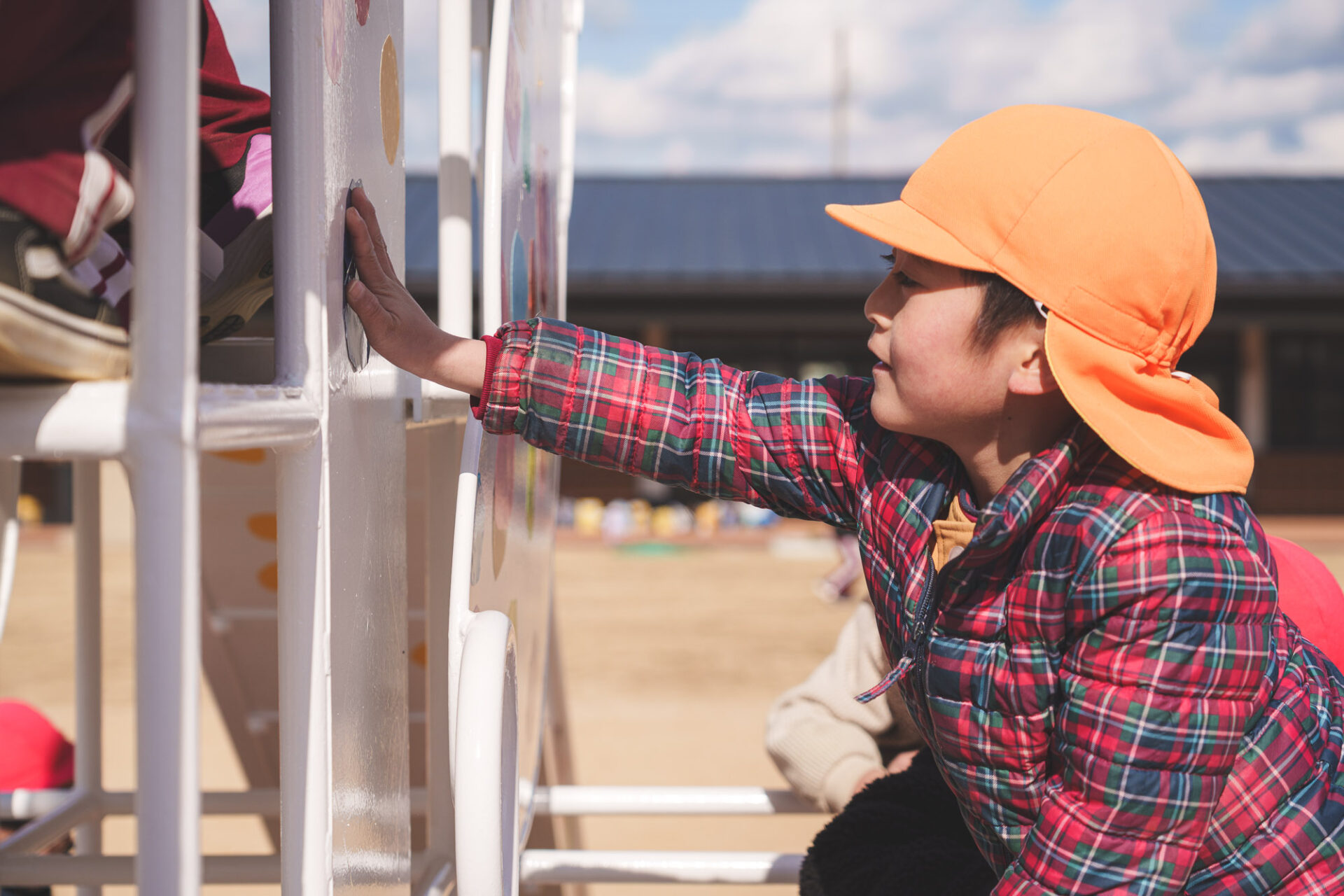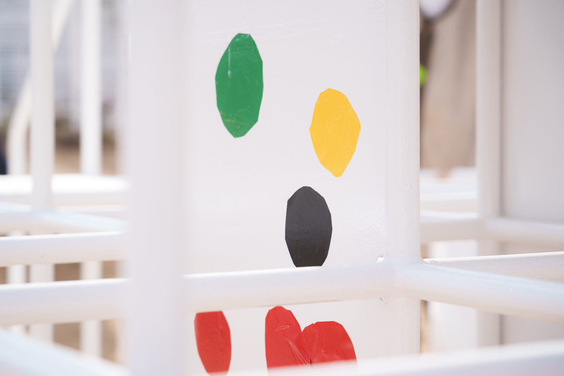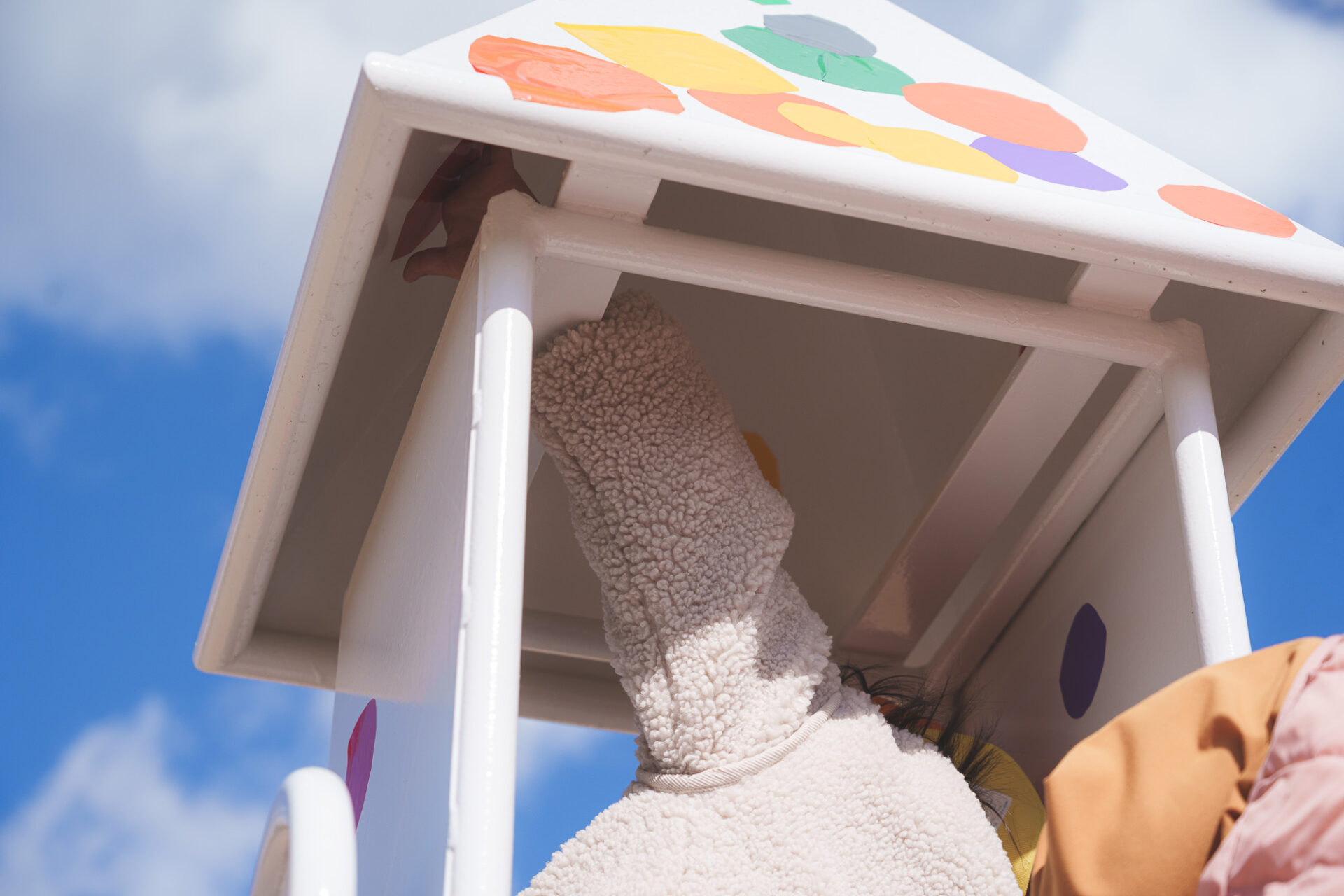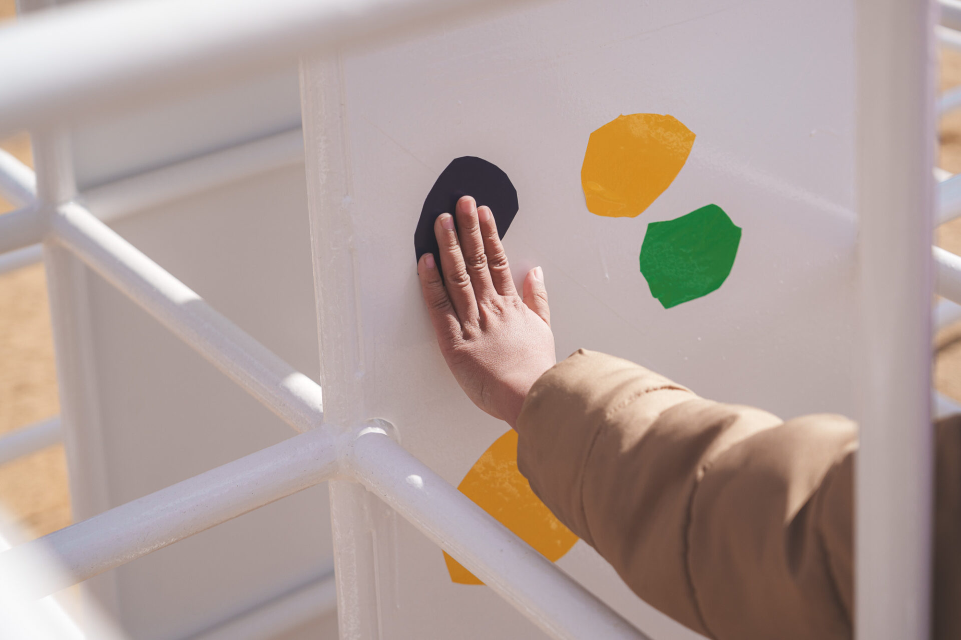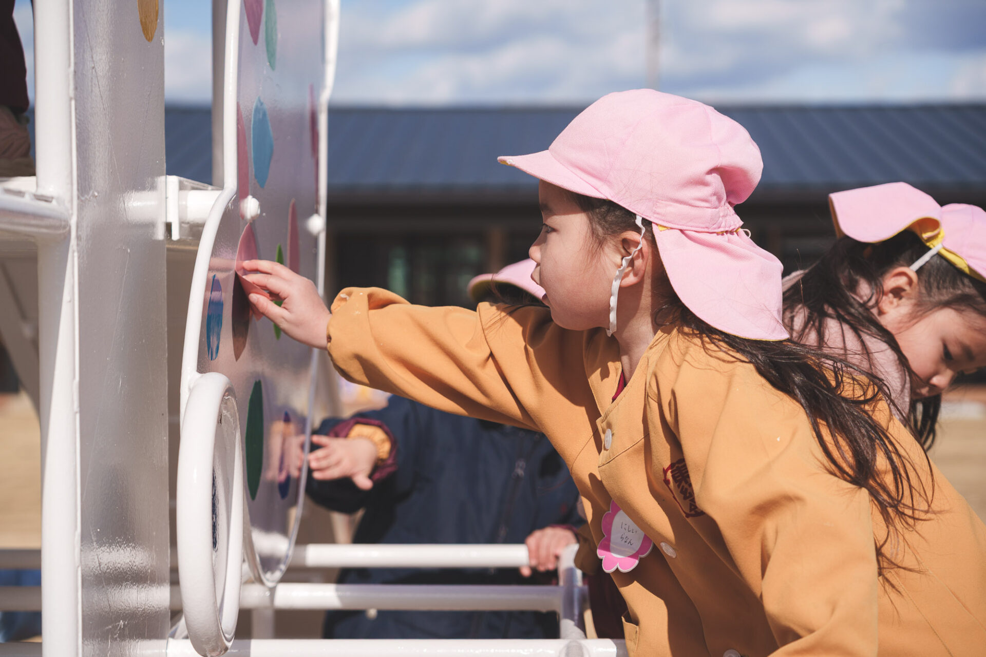 形と色で園児それぞれの「個性」を発揮した横断幕に対して、すべり台では、みんなで大量のまるをつくり、ひとつの遊具を完成させる「協力・共有」体験を創造プロセスに組み込みました。
