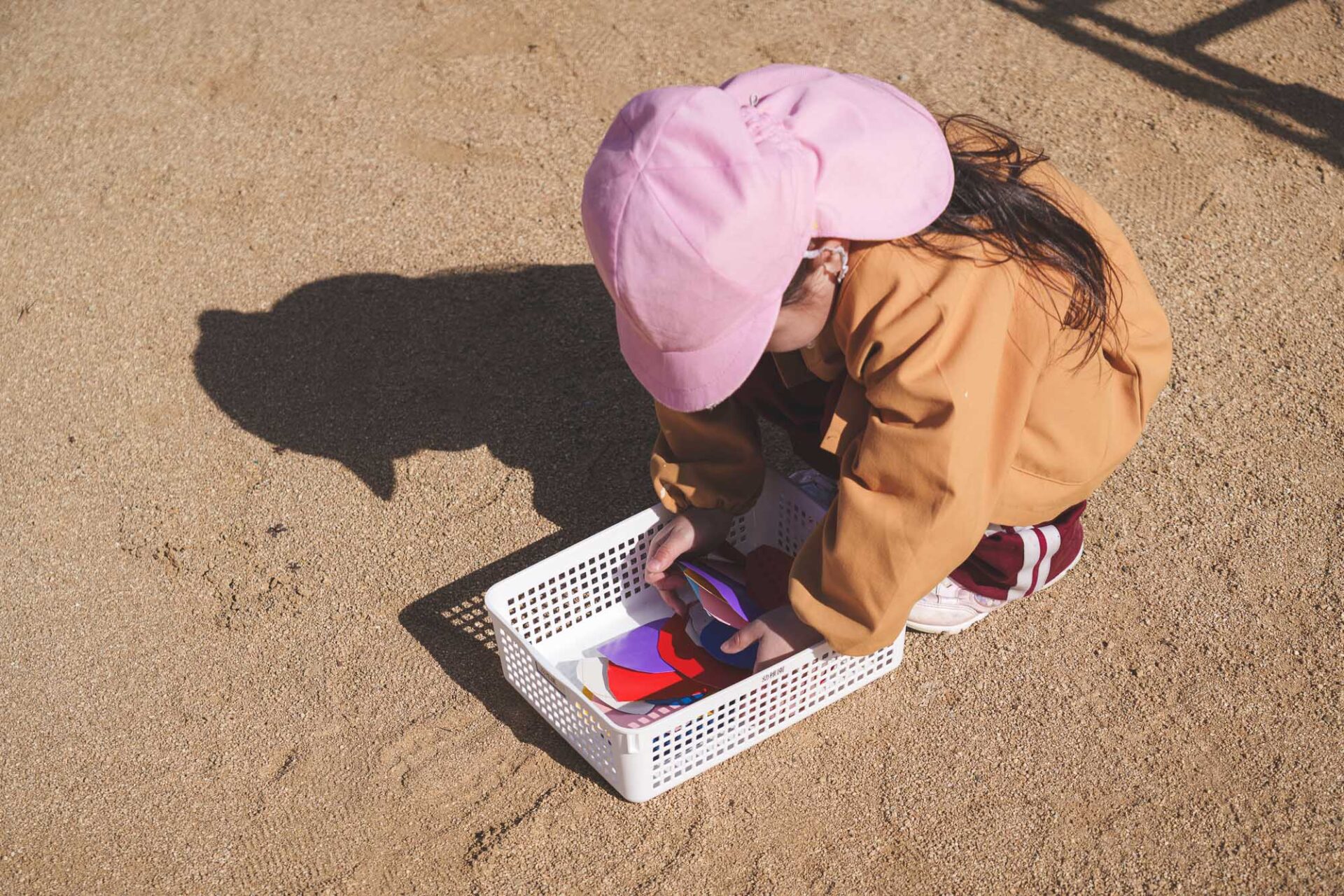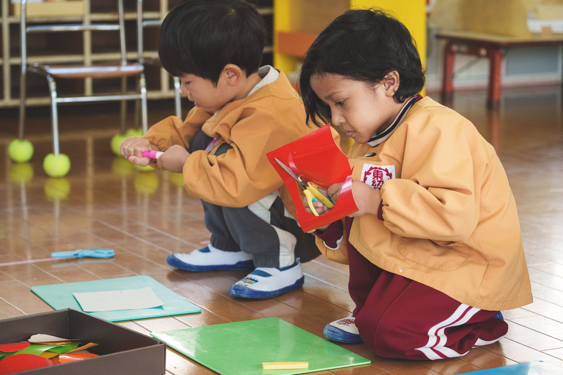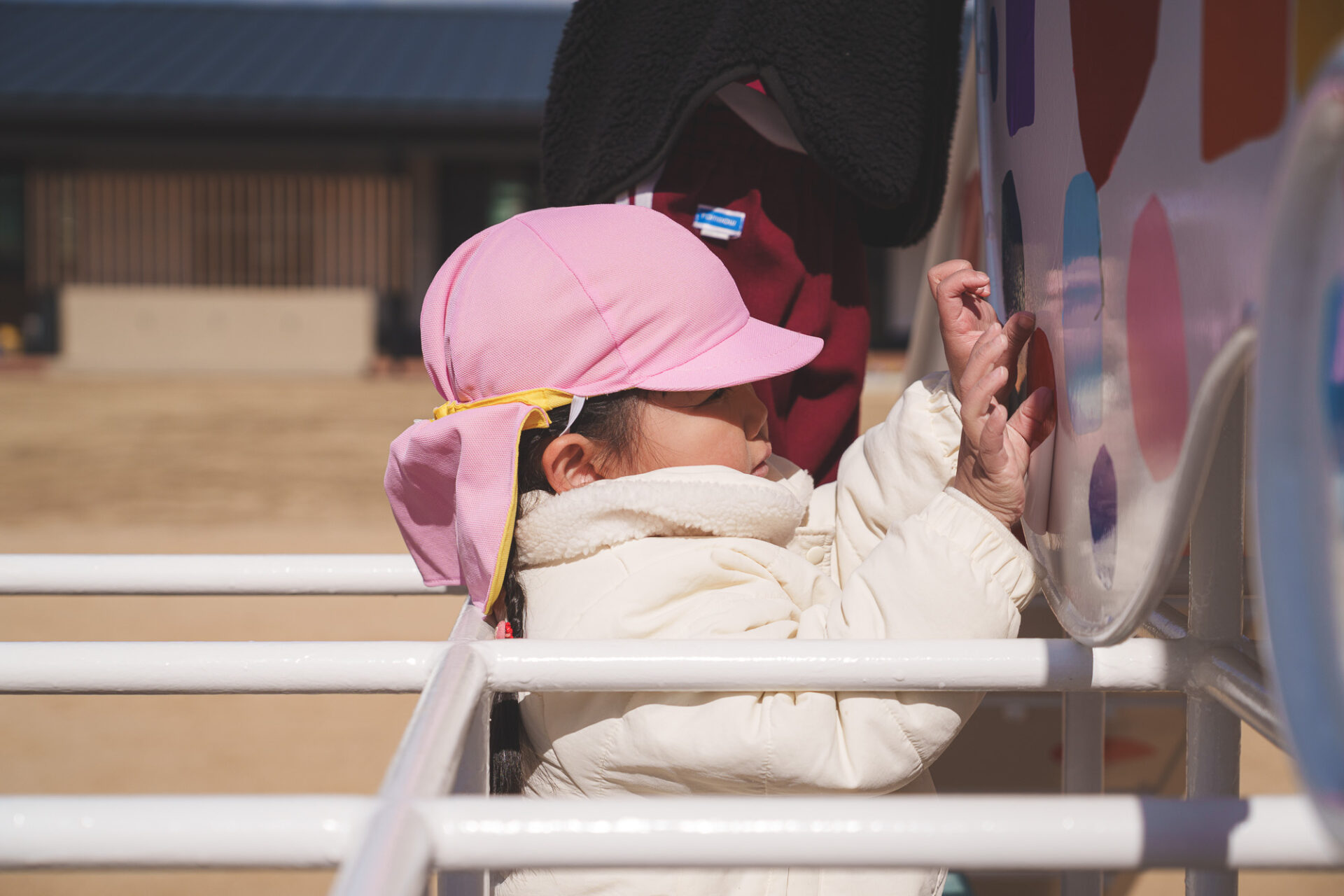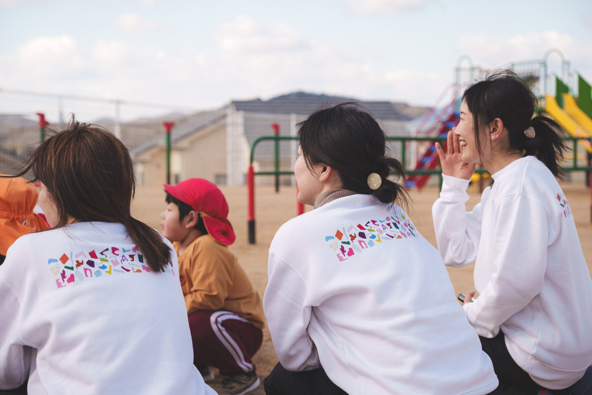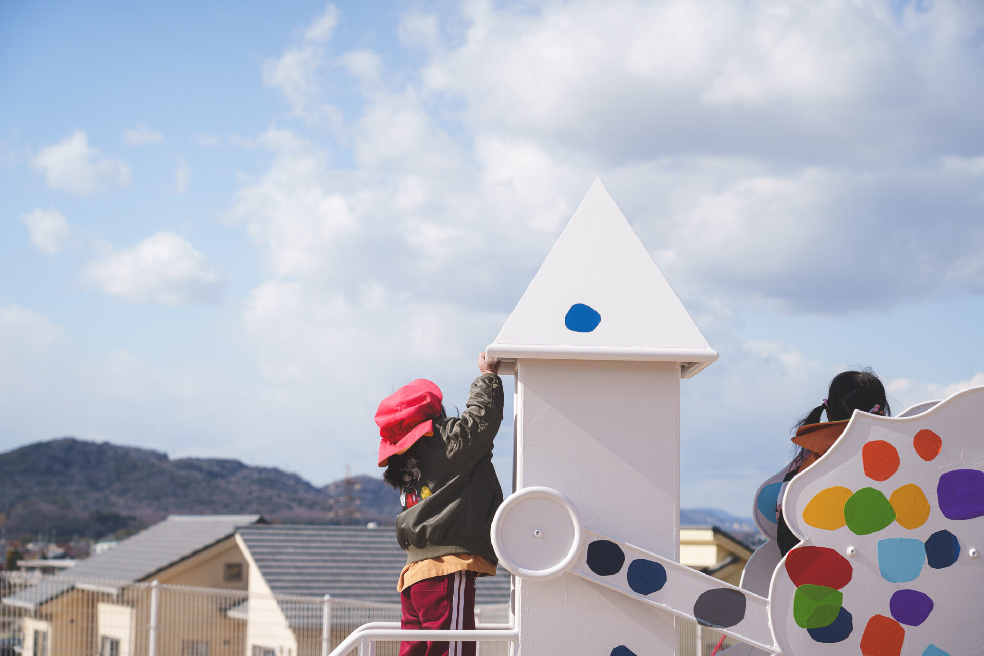 形と色で園児それぞれの「個性」を発揮した横断幕に対して、すべり台では、みんなで大量のまるをつくり、ひとつの遊具を完成させる「協力・共有」体験を創造プロセスに組み込みました。